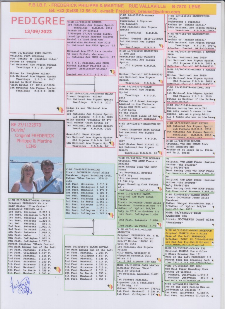 Uit: ”PIPA Daniël”, zoon ”Daniël”, 1. Nat. Asduif Sprint KBDB, uit kld. ”Best Kittel”, 1. & 4. Nat. Asduif Sprint KBDB x ”Dark Caviar”, 1/2 zus 1.-2.515 d., 1.-1.747 d., 1.-1.472 d., 1.-1.320 d., 2.-1.931 d., 3.-1.661 d., 4.-1.049 d.