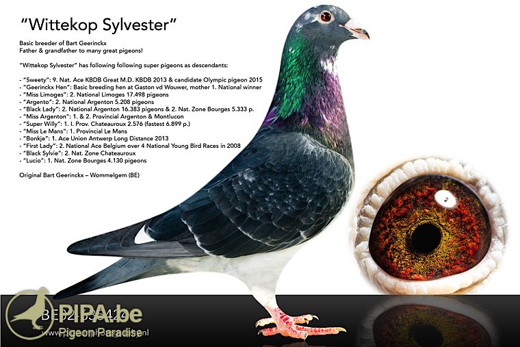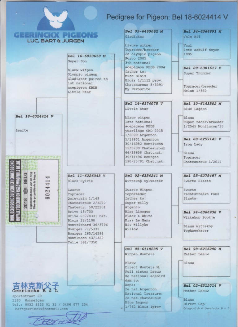 Uit: ”Super son”, zoon ”Gladiator”, 2. Olympiade, zoon ”Little Star”, 1. Nat. Asduif KBDB GHF x ”Black Sylvie”, 1.-149 d., 2. Prov. Chateauroux 3.270 d., dochter ‘‘Wittekop Sylvester” & “Witpen Wouters”.