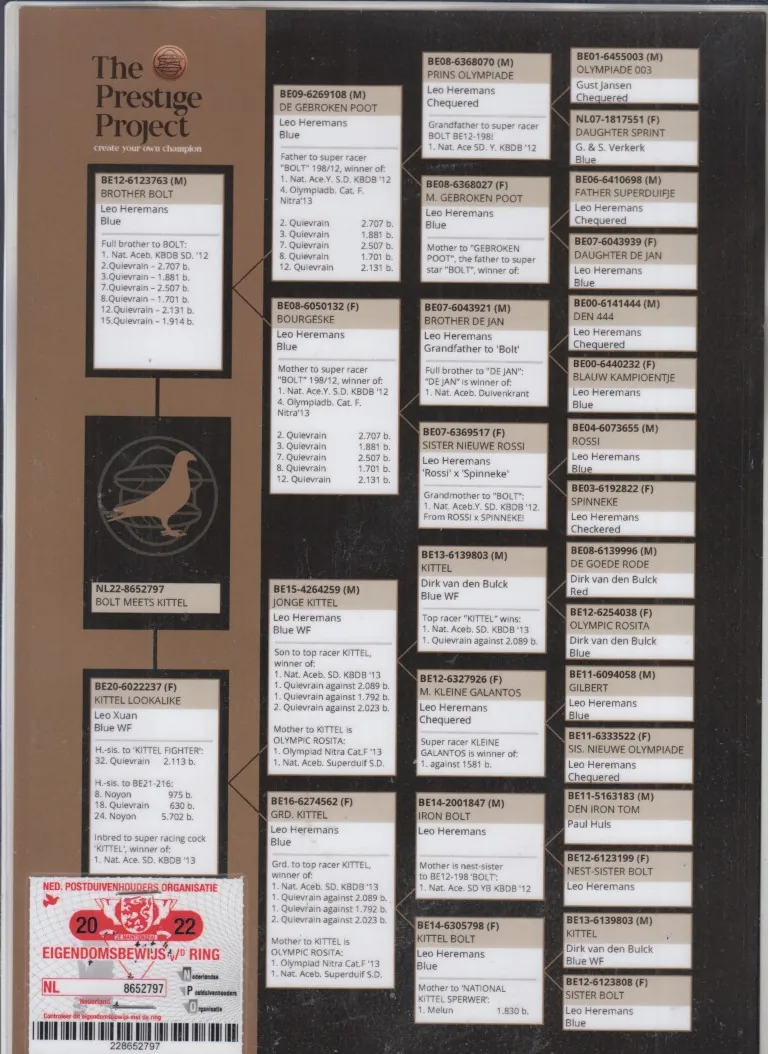Grootmoeder van ‘Bolt’, 1. Nat. Asduif Y. Vitesse K.B.D.B. ’12.