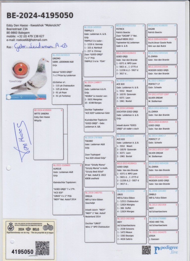 Uit: ”Grizmo”, inteelt klz. ”Goed Grijs”, 7x 1. Prijs & 1. NPO Laon 6.371 d., uit 1/2 zus ”Grizzle Mama” x ”Aurelie”, uit broer ”Grizzle Mama”, moeder ”Grizzle Best Kittel”, 2. Nat. Asduif Sprint KBDB, uit zoon ”Ace 820” & ”Goed Grijs”