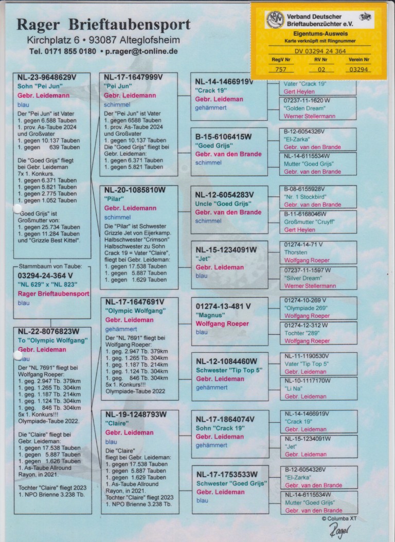 Uit: ”Sohn Pei Jun”, zoon ”Pei Jun”, vader 1. Prov. Asduif, 1.-6.588 d., gr-vader 1.-10.137 d. & zoon ”Crack 19” & ”Goed Grijs” x ”To. Olympic Wolfgang”, dtr. ”Olympic Wolfgang”, Olympiade duif, dtr. ”Claire”, 1.-17.538 d., 1.-5.887