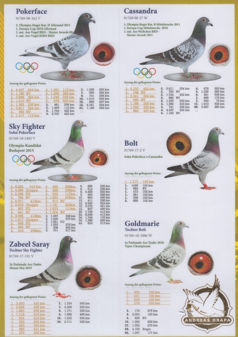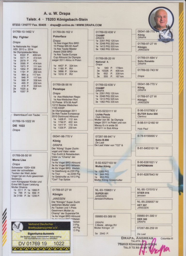 Uit: ”Sky Fighter”, 1. Nat. Asduif, 5. Olympiade duif, 1.-8.322 d., 1.-5.571 d., 1.-3.595 d., 1.-2.879 d., 1.-1.973 d., 1.-1.854 d., 1.-1.191 d., zoon ”Pokerface” x ”Mona Lisa”, moeder ”Shakira”, 1.-2.311 d., 1.-1.966 d., 1.-766 d., 1.-699 d.