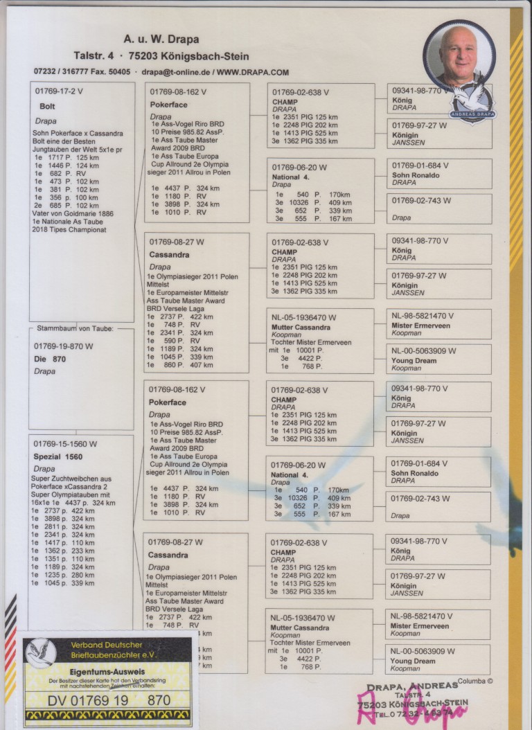 Uit: ”Bolt”, 1.-1.717 d., 1.-1.446 d., vader 1. Nat. Asduif, zoon ”Pokerface”, 1. Nat. Asduif, zoon ”Cassandra”, 1. Olympiade duif x ”Spezial 1560”, dochter ”Pokerface”, 1. Nat. Asduif, dochter ”Cassandra”, 1. Olympiade duif