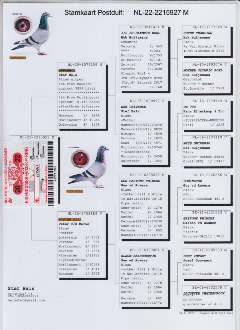 Uit: ”Superboy”, 1. Prov. Pt.St.Maxence 9.829 d., 4. Prov. Morlincourt 10.746 d. (Achter 3 hokgenoten), zoon Stammoeder ”New Universe” x ”Sister Jill”, moeder 1.-1.351 d., gr-moeder 1.-10.746 d., 1.-4.614 d., 1.-2.508 d.