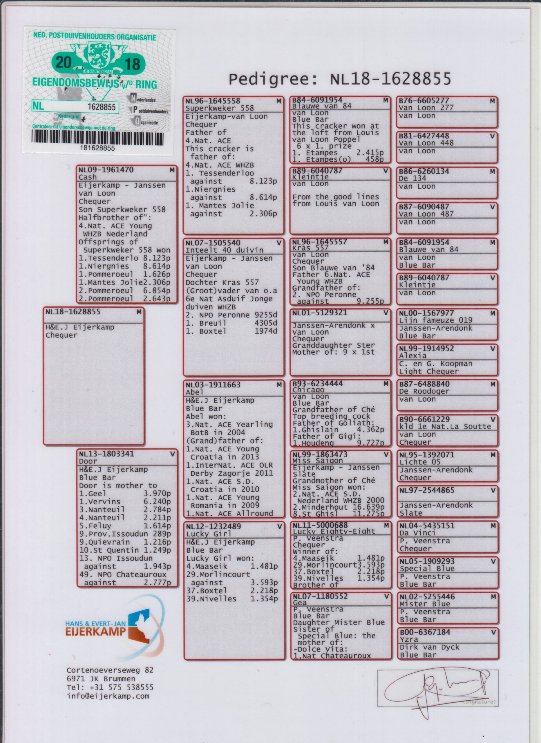 Uit: ”Cash”, 1/2 broer 4. Nat. Asduif WHZB, Eijerkamp, van Loon & Janssen lijn x ”Door”, moeder 1.-6.240 d., 1.-3.970 d., 3.-2.784 d., 4.-2.211 d., 5.-1.614 d., 9. Prov. Issoudun, 9.-1.216 d., 10.-1.249 d., 13. NPO Issoudun