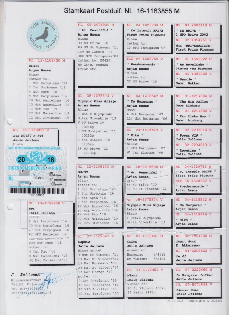 (1/2) broer 1. Nat. Barcelona, 3. Int. Narbonne, 6. Int. Pau, 8. Nat. Agen, 9. Nat. Perpignan, 8. & 10. Nat. Barcelona, uit: ”MG430”, legendarische stamduif Jelle Jellema x ”Evi”, 9. & 27. Nat. Perpignan, 10. Nat. Barcelona