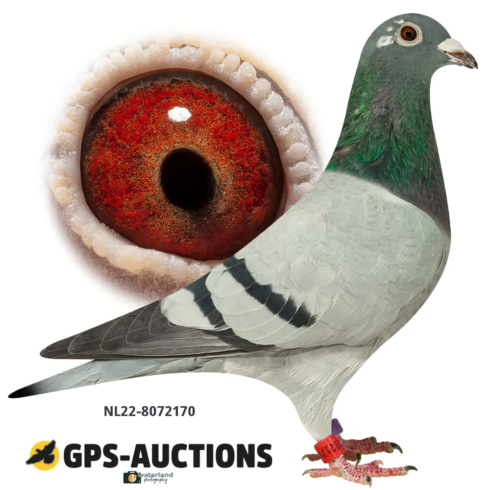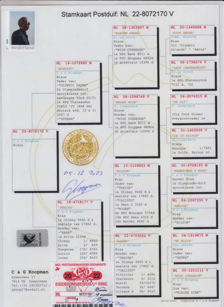 Uit: ”Augusto”, vader ”Olympic Gaura”, 2. Olympiade duif Cat. Dagfond, 1. NPO Chateaudun 5.507 d., broer ”Miss Overegge” x ”Thaisa”, 1. Inter-Prov. Chimay 17.862 d., moeder ”Rana”, 1.-2.135 d., 2.-3.371 d., 5.-5.962 d.