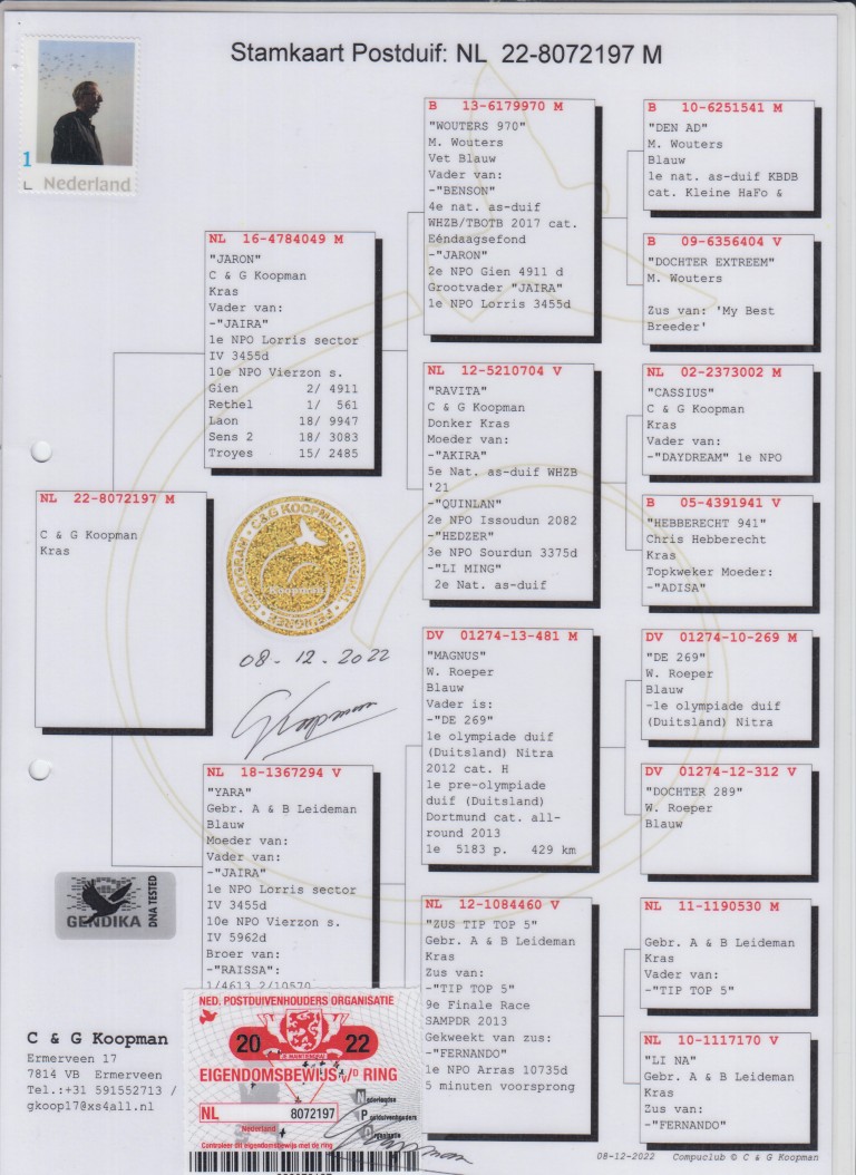 Uit: ”Jaron”, 1.-561 d., 2. NPO 4.911 d., vader ”Jaira”, 1. Nat. Lorris 3.455 d., 10. Nat. Vierzon 5.962 d. x ”Yara”, Gebr. A. & B. Leideman, moeder ”Jaira”, 1. Nat. Lorris 3.455 d., 10. Nat. Vierzon 5.962 d., zus ”Raissa”