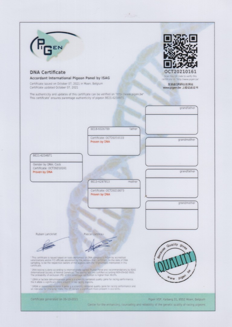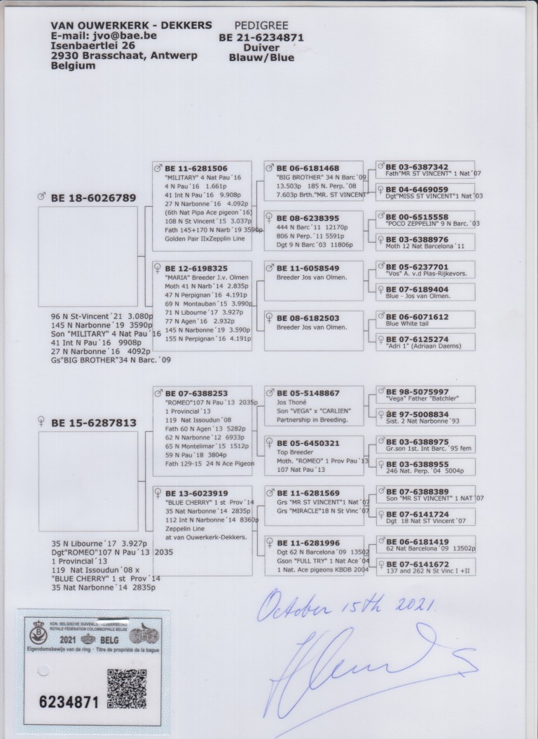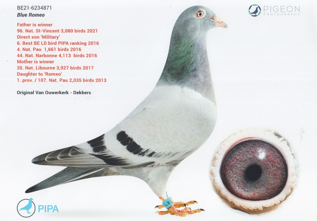 Uit: ”De 789”, 96. Nat. St.Vincent 3.080 d., 145. Nat. Narbonne 3.590 d., zoon ”Military”, 4. Nat. Pau 1.661 d. x ”De 813”, 35. Nat. Libourne 3.927 d., dochter ”Romeo”, 1. Prov. Issoudun, dochter ”Blue Cherry”, 1. Prov. Narbonne