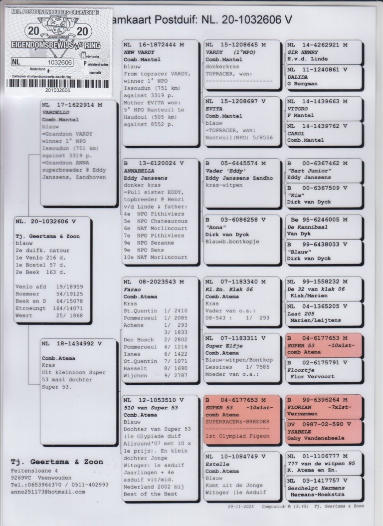 ”De 606”, 2x 1. Prijs, 2. Asduif Sprint Natour, 19.-18.959 d., 25.-1.868 d., 54.-19.125 d., 64.-15.078 d., 164.-14.071 d., uit: ”Vardello”, uit zoon ”Vardy”, 1. NPO Issoudun 3.319 d. x ”De 992”, dtr. ”Farao”, 1.-2.410 d., 1.-2.085 d.