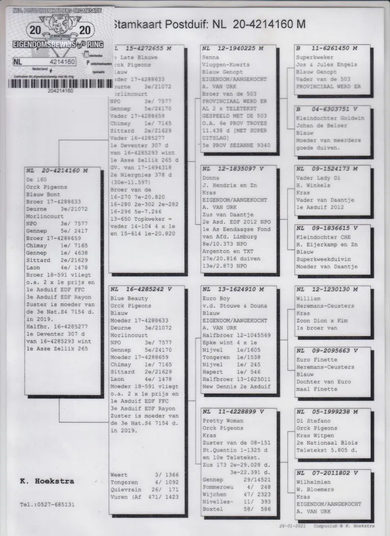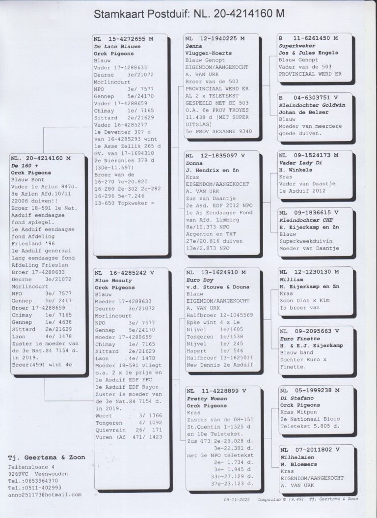 ”De 160”, vader 1. Arlon 847 d., 8. Inter-Prov. Arlon 22.006 d., broer 1. Nat. Asduif Fondspiegel, 1. Prov. Asduif Dagfond, 1.-7.165 d., 1.-4.638 d., 2.-21.629 d., 3.-21.072 d., 3.-7.577 d., uit: ”De Late Blauwe” x ”Blue Beauty”