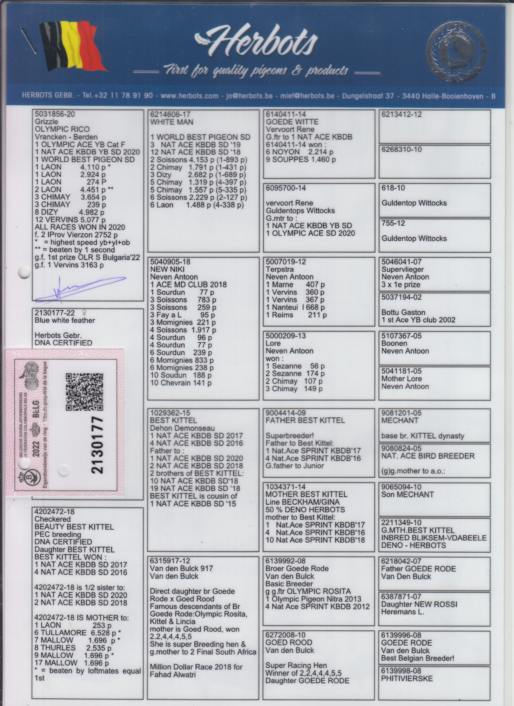 Uit: ”Olympic Rico”, 1. Int. Asduif FCI, 1. Olympiade duif, 1. Nat. Asduif KBDB, gr-vader ”Little Rico”, 1. Olympiade duif 2026, 1. Nat. Asduif FCI Duitsland x ”Beauty Best Kittel”, dochter ”Best Kittel”, 1. & 4. Nat. Asduif KBDB