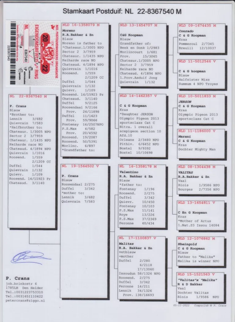 ”De 540”, broer 3.-682 d., 7.-583 d., 1/2 broer 1. NPO 3.005 d., 1. NPO 1.435 d., 1.-1.016 d., 1.-559 d., 1.-544 d., uit: ”Moreno”, Superkweker, 100% C. & G. Koopman x ”De 502”, 2.-275 d., 3.-342 d. uit zoon ”Valitas”