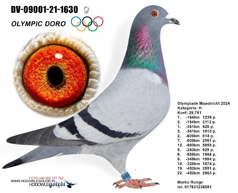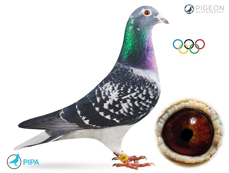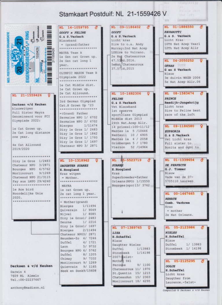 Uit: ”Goofy x Felline”, gr-vader ”Olympic Mason”, 1. Olympiade duif Cat. Grown UP, 1. NPO Sermaises 6.702 d., gr-vader 3. Olympiade Duitsland x ”Daughter Suarez”, Superkweekduivin
