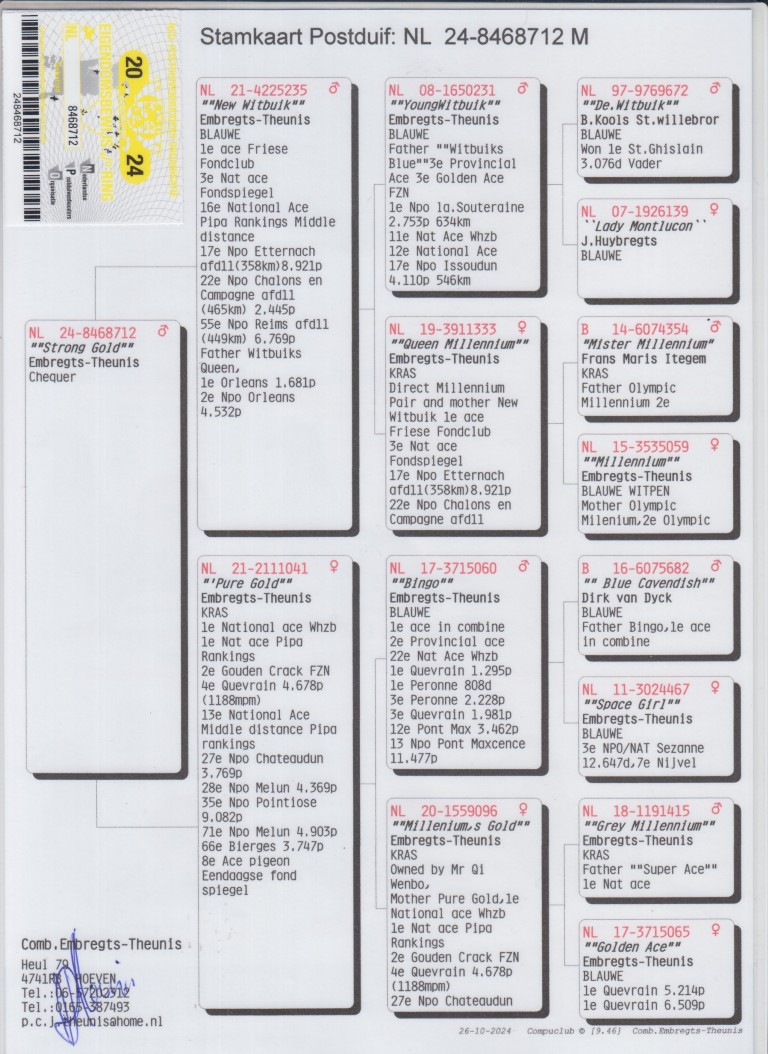 Uit: ”New Witbuik”, 1. Prov. Asduif Friese Fondclub, 3. Nat. Asduif Jonge Duiven Midfond x ”Pure Gold”, 1. Nat. Asduif Jonge Duiven WHZB & PIPA