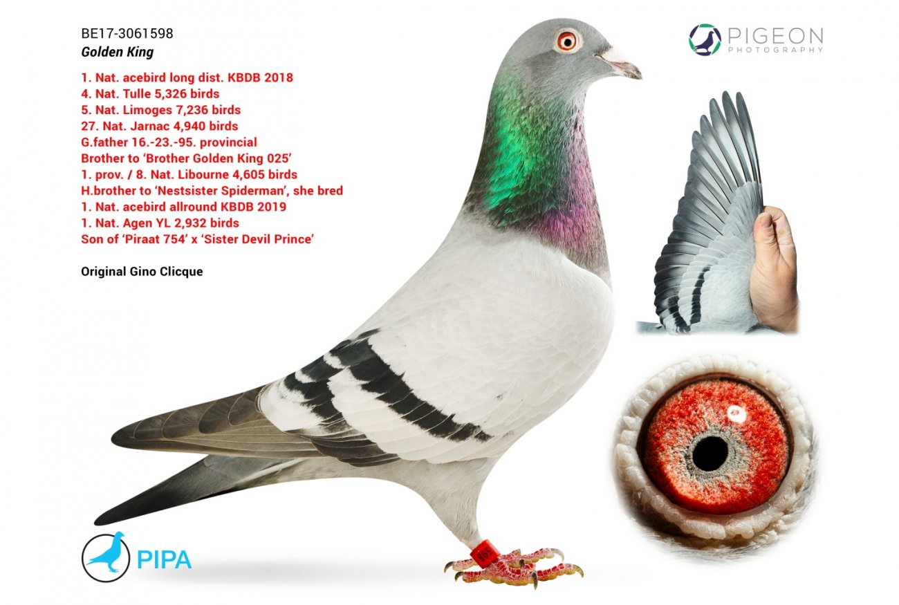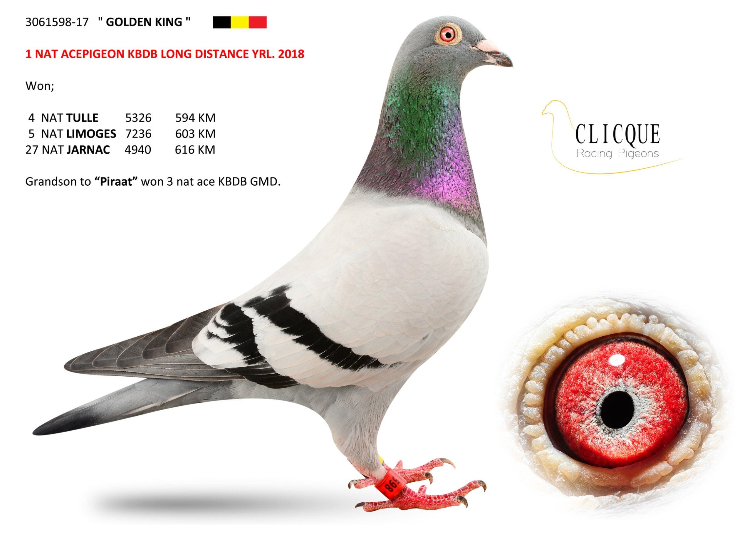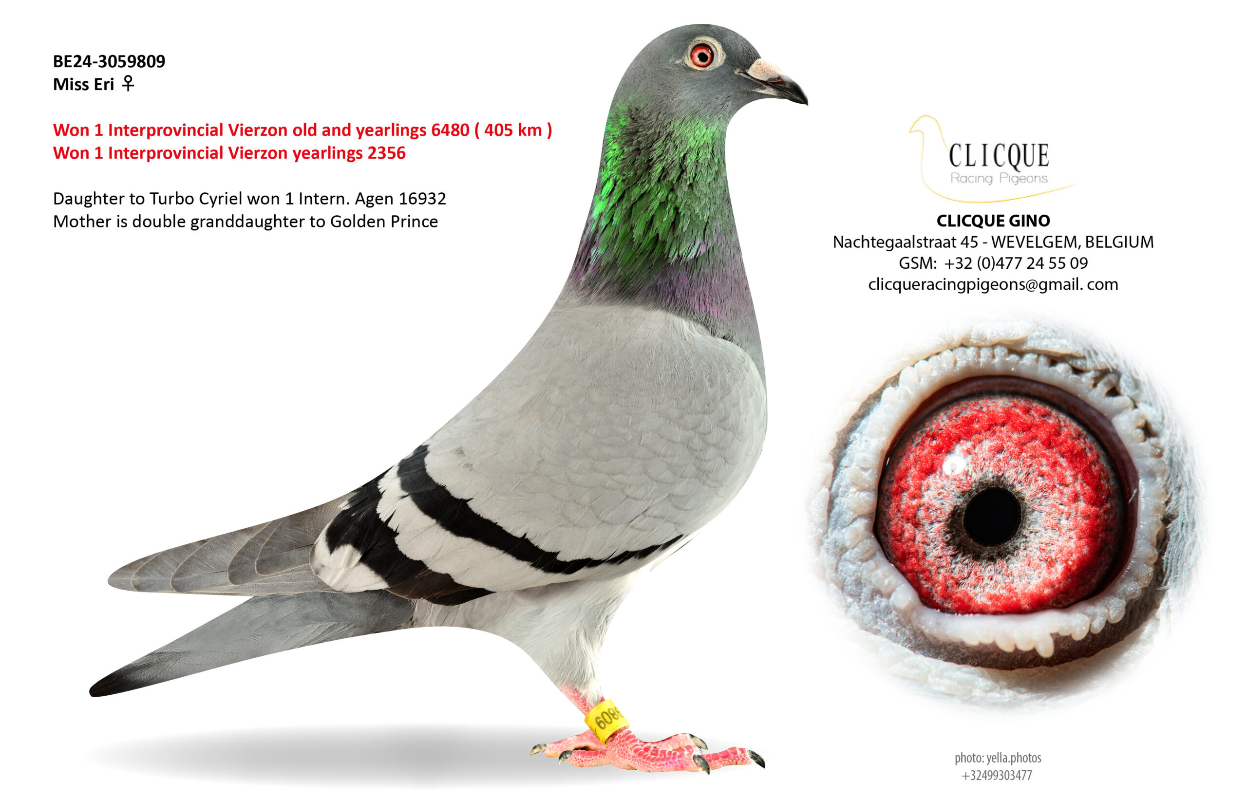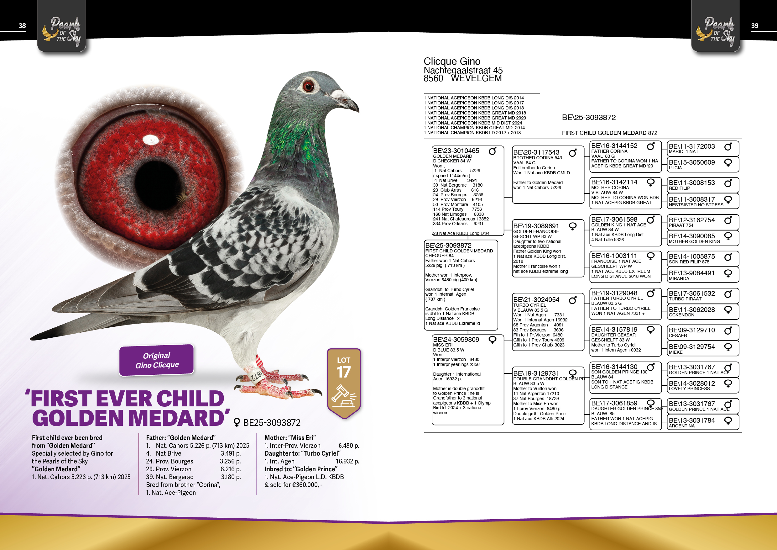出自: ”黄金梅达尔德”, 1位全国卡奥尔5.226 羽, 4位全国布瑞福  3.491 羽, 24位省赛 3.256 羽, 28位全国鸽王 , 29位省赛 6.216 羽, 39位全国  3.180 羽 x ”艾瑞小姐”, 1位省联赛威尔森 6.480 羽,  ”涡轮西里尔”女儿, 1位阿让国际 16.932 羽