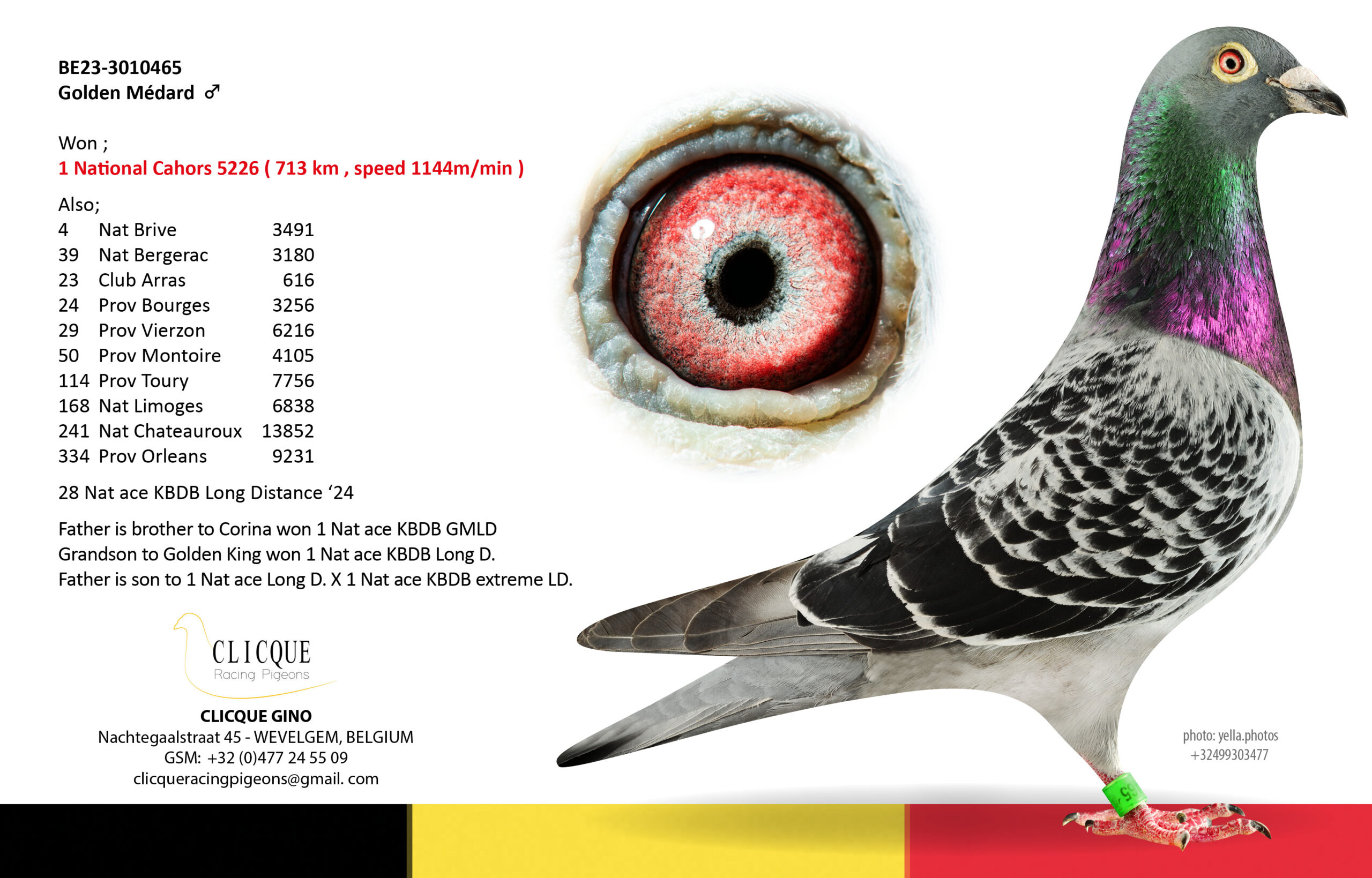 Uit: ”Golden Medard”, 1. Nat. Cahors 5.226 d., 4. Nat. Brive 3.491 d., 24. Prov. 3.256 d., 28. Nat. Asduif, 29. Prov. 6.216 d., 39. Nat. 3.180 d. x ”Miss Eri”, 1. Inter-Prov. Vierzon 6.480 d., dtr. ”Turbo Cyriel”, 1. Int. Agen 16.932 d.