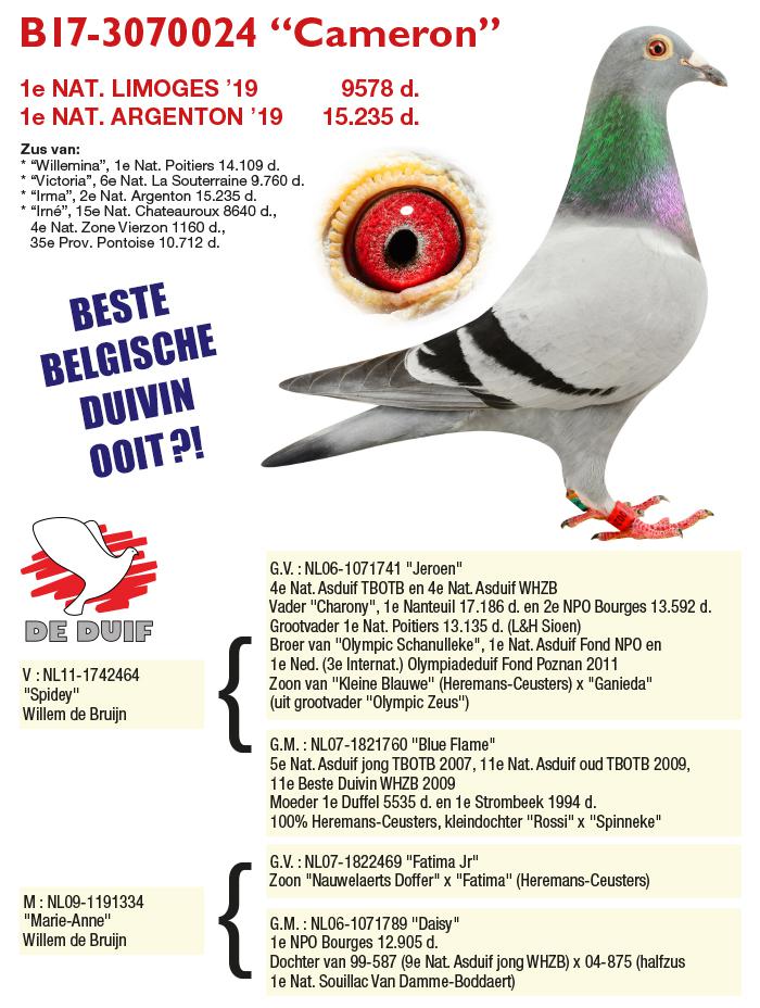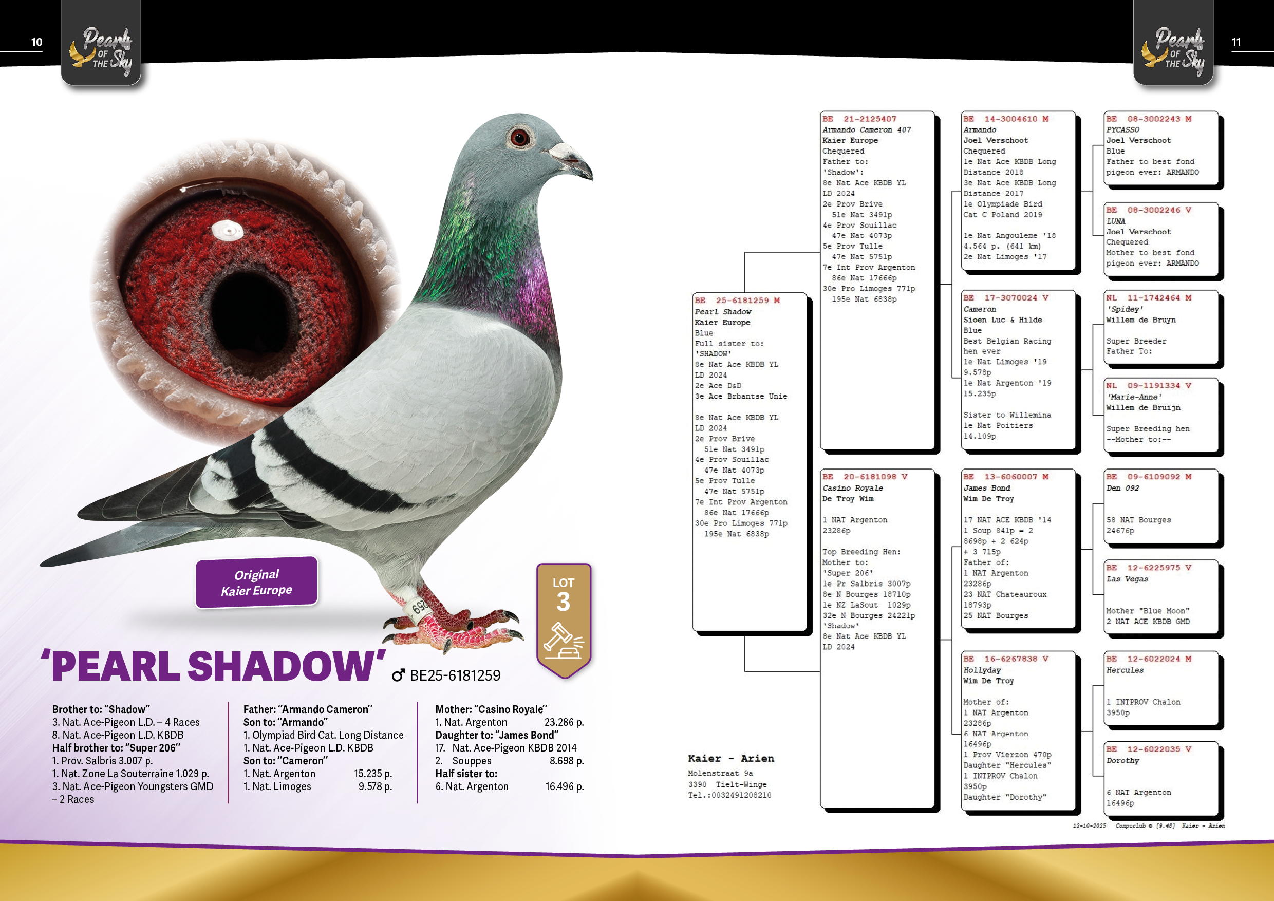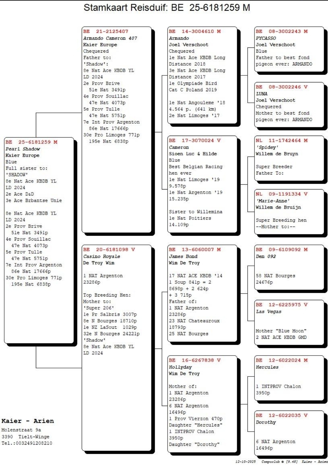 Uit: ”Armando Cameron”, vader ”Shadow”, 8. Nat. Asduif KBDB, zoon ”Armando” & ”Cameron” x ”Casino Royale”, 1. Nat. Limoges 23.826 d., moeder ”Super 206”, 1. Prov. Salbris 3.007 d., 1. Nat. Zone La Sout. 1.029 d.