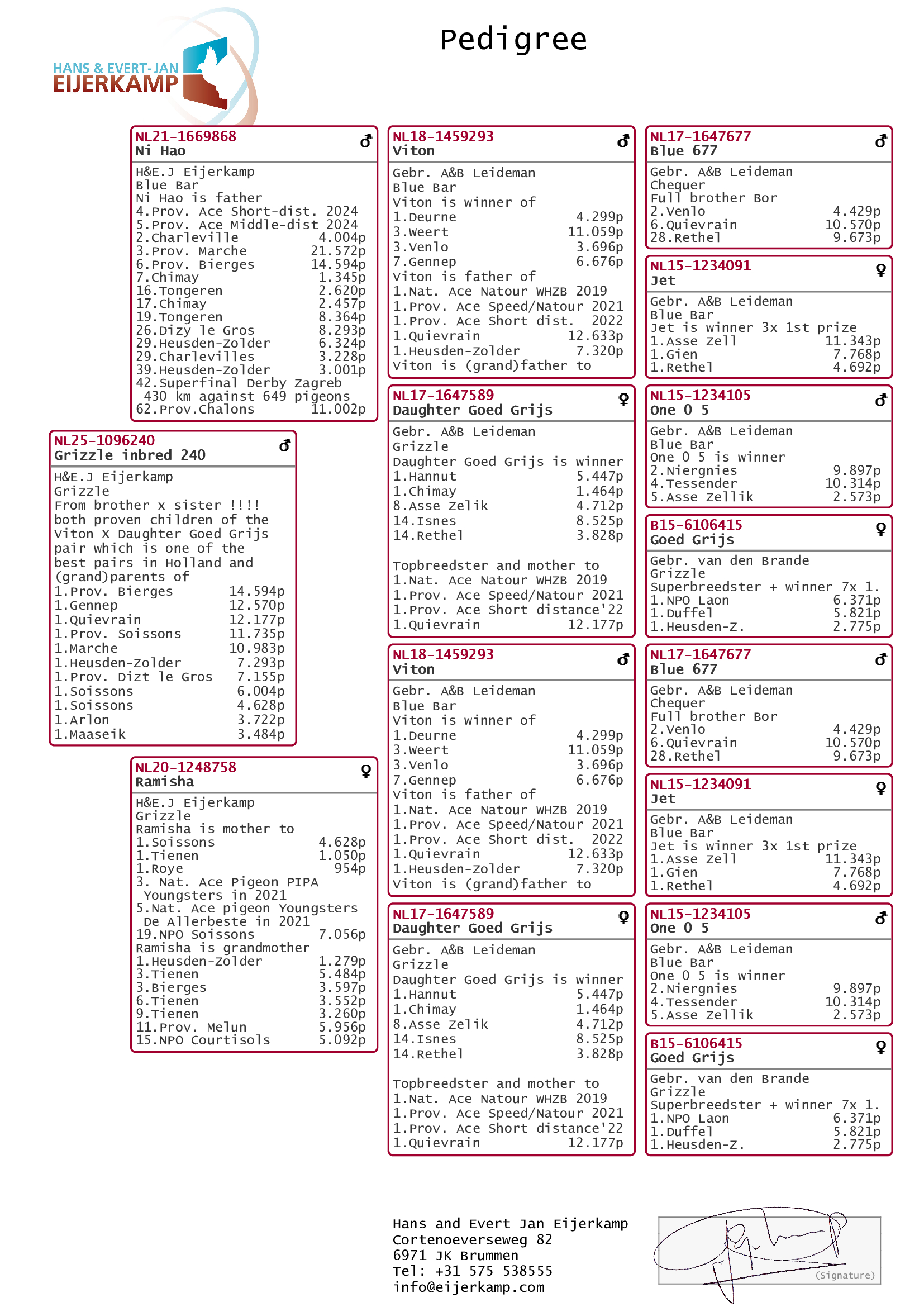 Uit: ”Ni Hao”, vader 4. & 5. Prov. Asduif, 2.-4.004 d., 3. Prov. 21.572 d., 6. Prov. 14.594 d., zoon ”Viton” & ”Dtr. Goed Grijs” x ”Ramisha”, moeder 1.-4.628 d., 1.-1.050 d., 3. & 5. Nat. Asduif, dochter ”Viton” & ”Dtr. Goed Grijs”