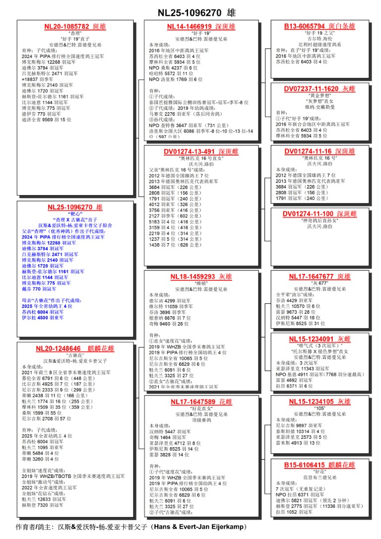 出自: ”查理”, 作出子代: PIPA全国速度鸽王冠军, 1位-12.268 羽, 1位-3.784 羽, 1位-2.471 羽, 1位-2.140 羽, 1位-1.720 羽 x ”古驰花”, 2021年全省季末赛速度鸽王冠军, 平辈 ”速度花”, 全国鸽王冠军 , 出自 ”维顿” & ”好花女儿”
