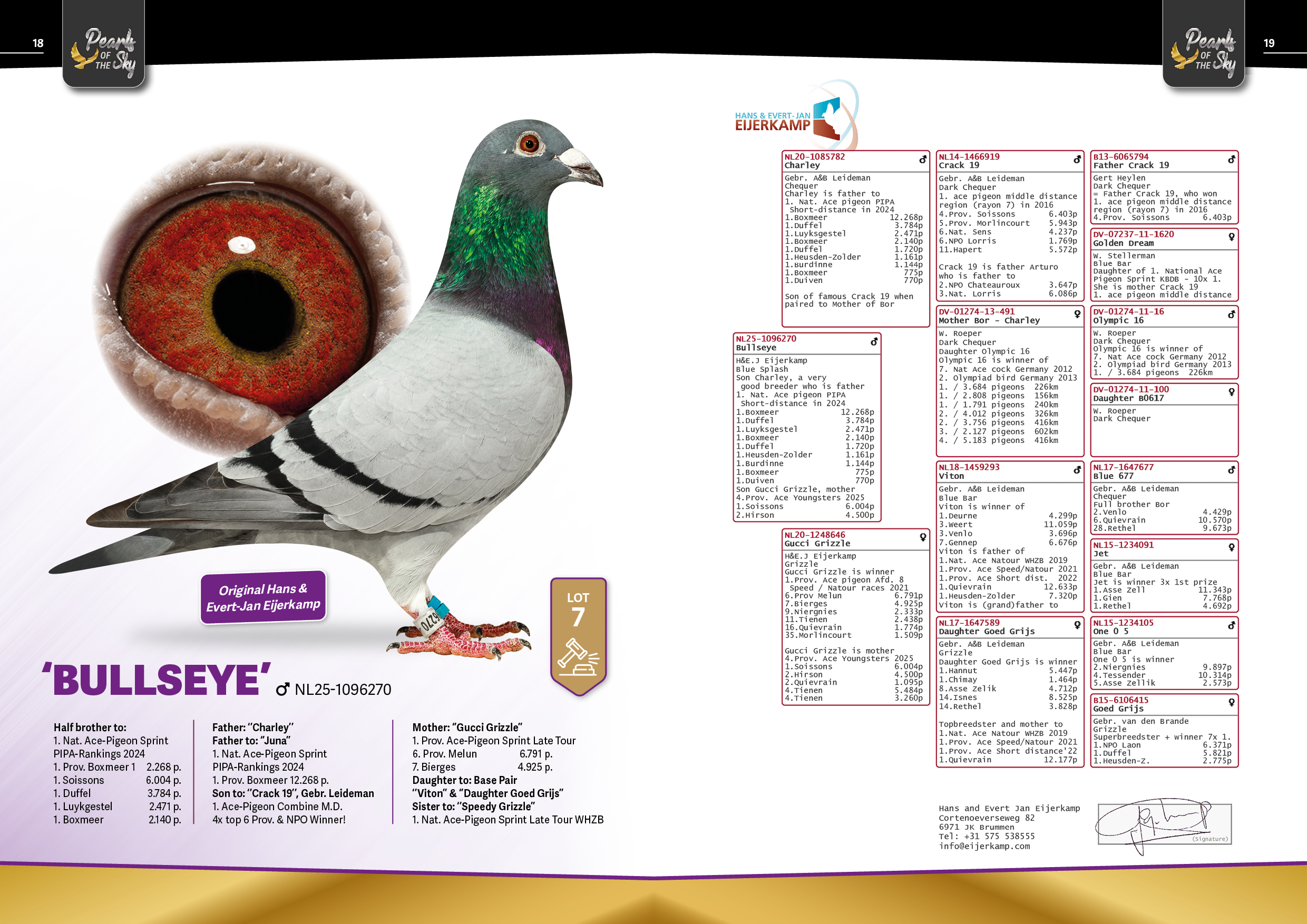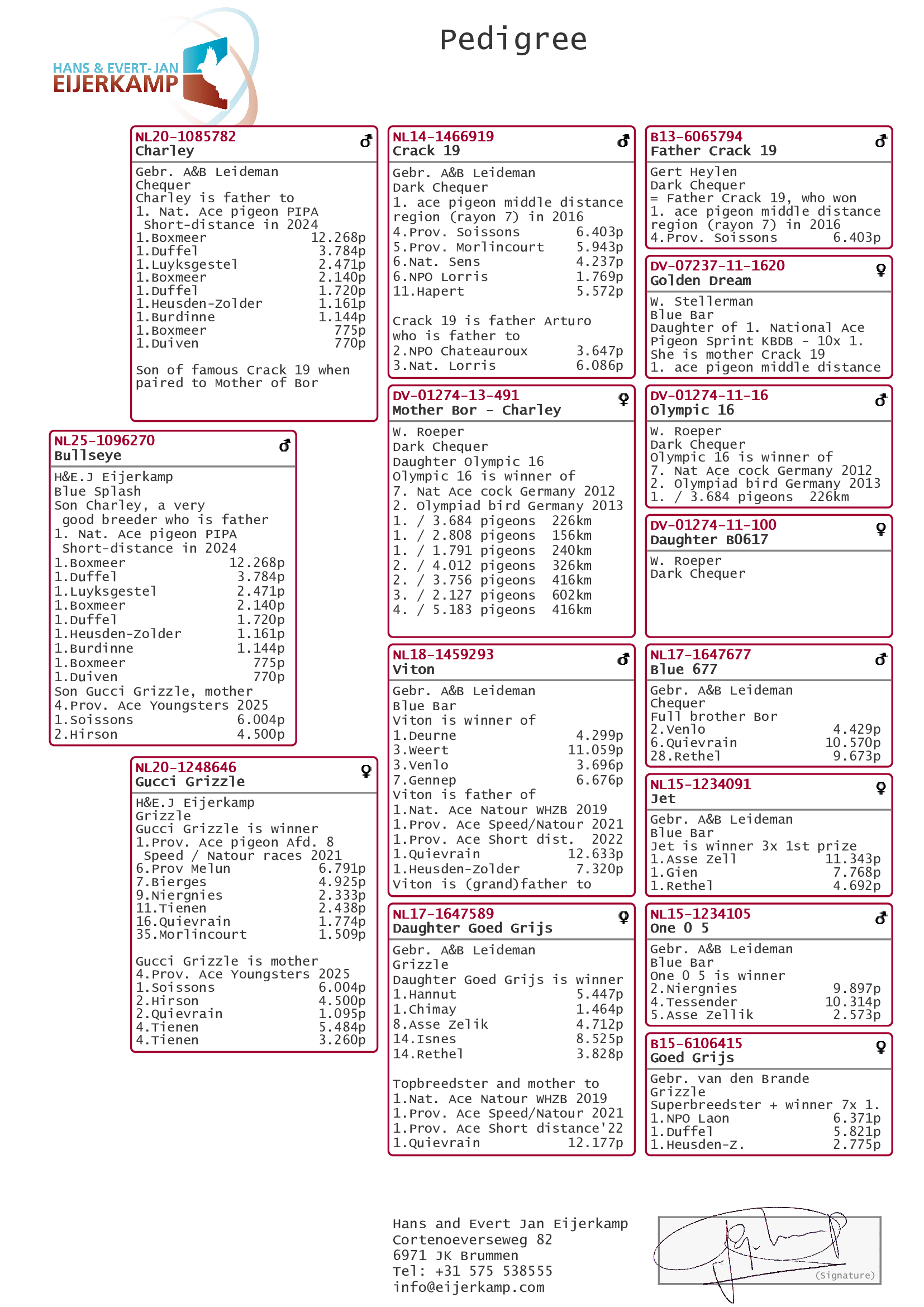 Uit: ”Charley”, vader 1. Nat. Asduif Sprint PIPA, 1.-12.268 d., 1.-3.784 d., 1.-2.471 d., 1.-2.140 d., 1.-1.720 d. x ”Gucci Grizzzle”, 1. Prov. Asduif Sprint Natour, zus ”Speedy Grizzle”, 1. Nat. Asduif, dtr. ”Viton” & ”Dtr. Goed Grijs”