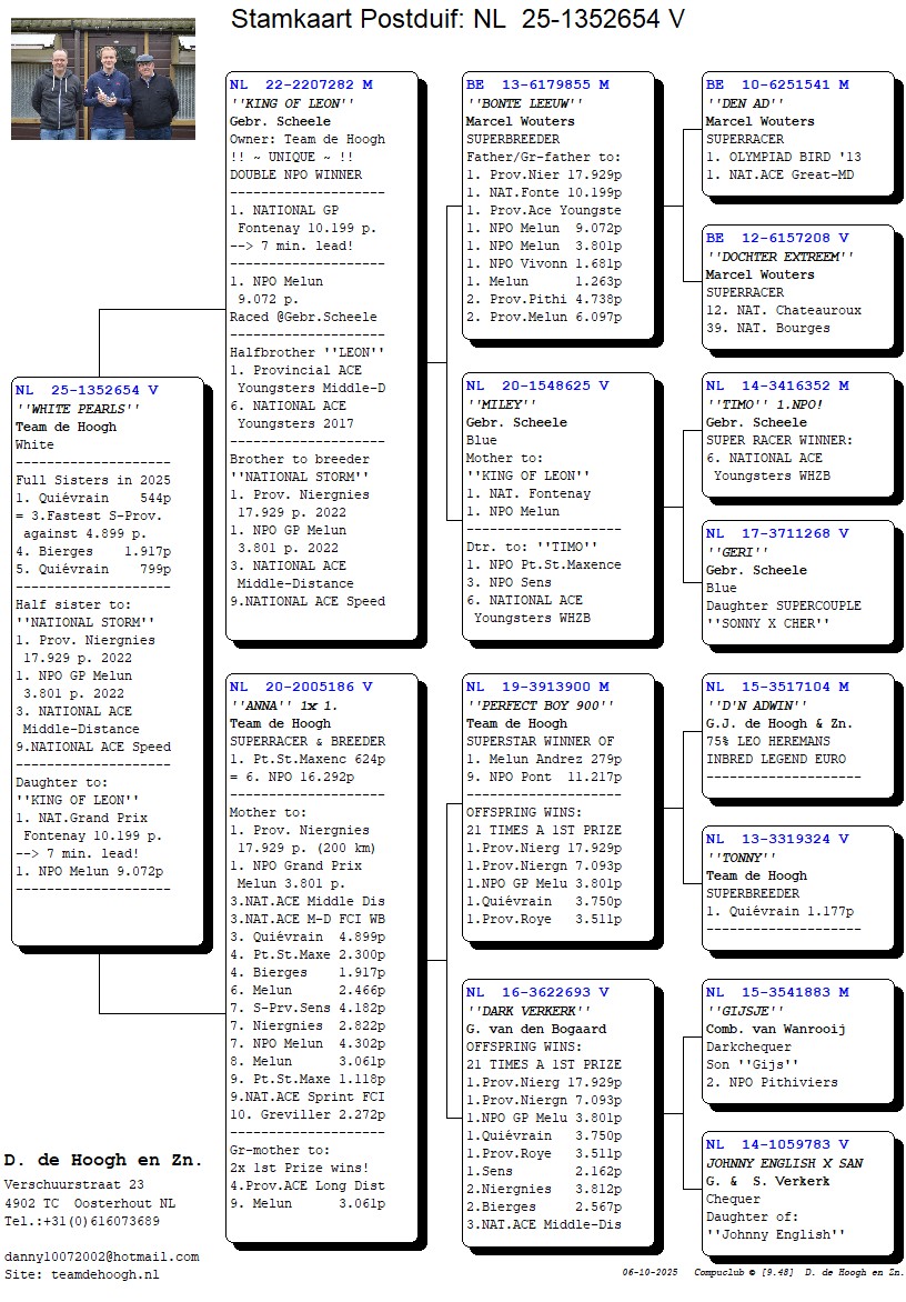 出自: ”莱昂国王”, 丰特奈全国大奖赛10199羽冠军 (领先7分钟), 1位 NPO 墨伦9.072 羽x ”安娜”, 6位NPO 16.292 羽,作出子代; 1位省赛17.929 羽, 1位NPO GP 3.801 羽, 3位-4位-4位-6位-7位-7位-7位-8位-9位-10位等等,平均参赛羽数 3.000 羽