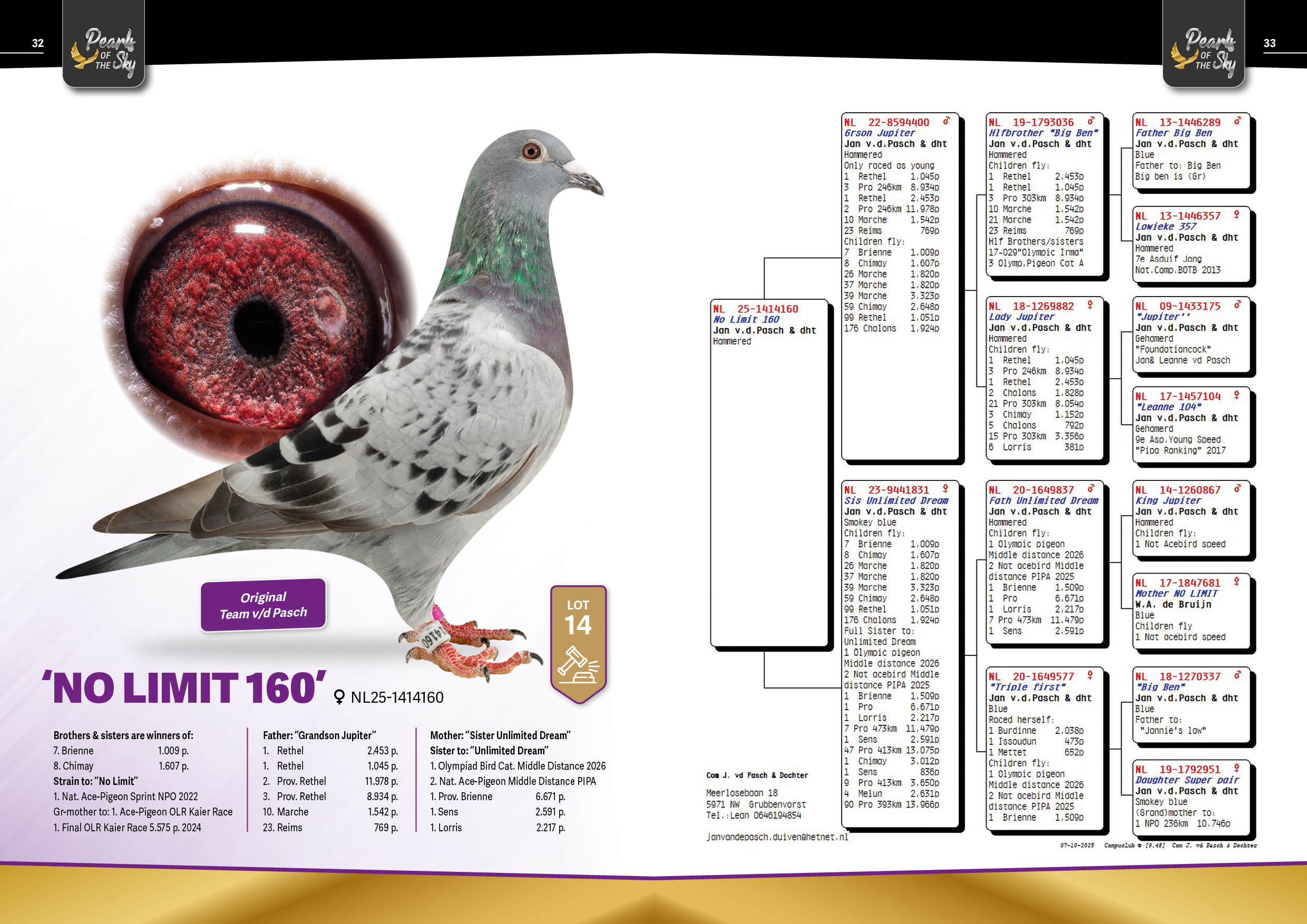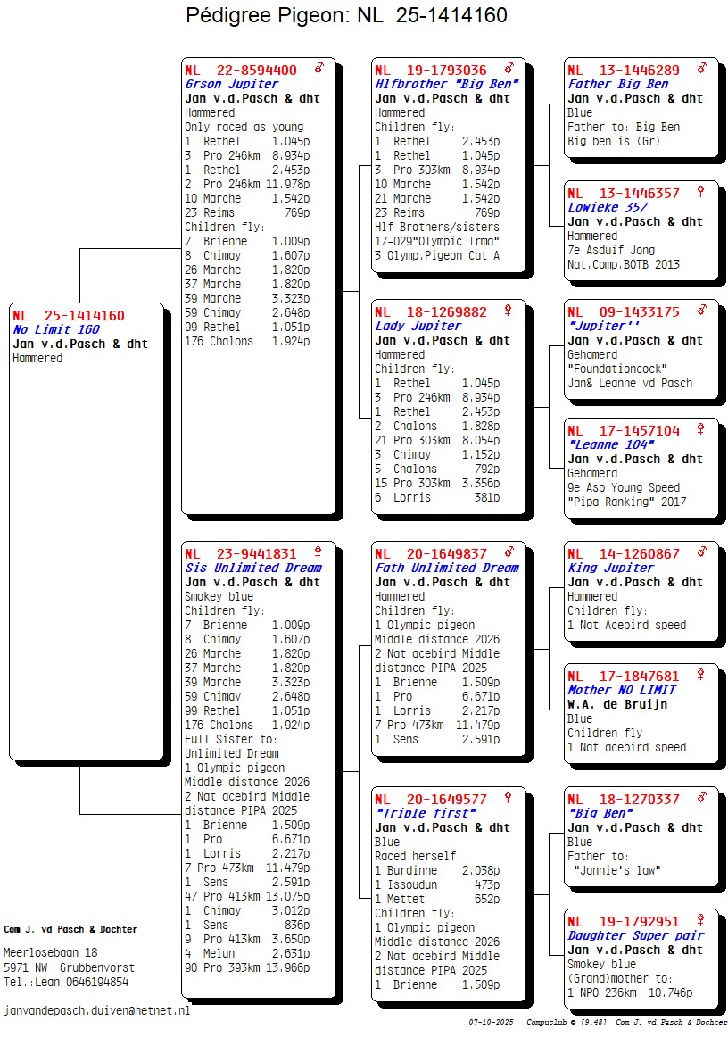 Uit: ”Grson Jupiter”, 1.-2.453 d., 1.-1.045 d., 2. Prov. 11.978 d., 3. Prov. 8.934 d., 10.-1.542 d. x ”Sis. Unlimited Dream”, zus ”Unlimited Dream”, 1. Olympiade Cat. Midfond, 2. Nat. Asduif Midfond, 1. Prov. 6.671 d., 1.-2.217 d.