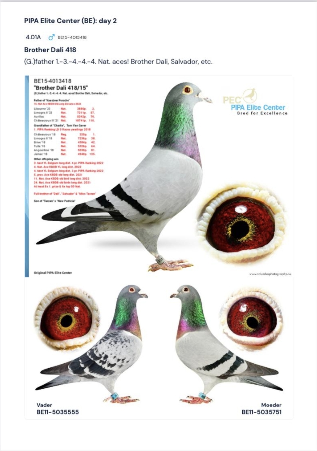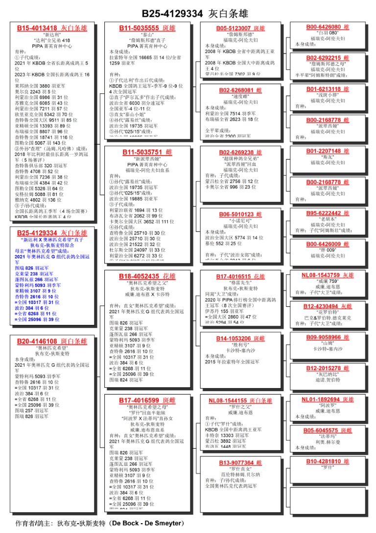出自: ”新达利418”, 作出孙代: 全国鸽王1位-3位-4位-4位-4位 , 2位全国莱邦纳 3.880 羽x ”“奥林匹克希望”, 年奥林匹克G组代表鸽全国冠军, 1位-826 羽, 3位省赛 5.093 羽, 9位全国大区 3.107 羽, 17位-2.118 羽, 31位全国 10.317 羽, 39位全国25.096 羽