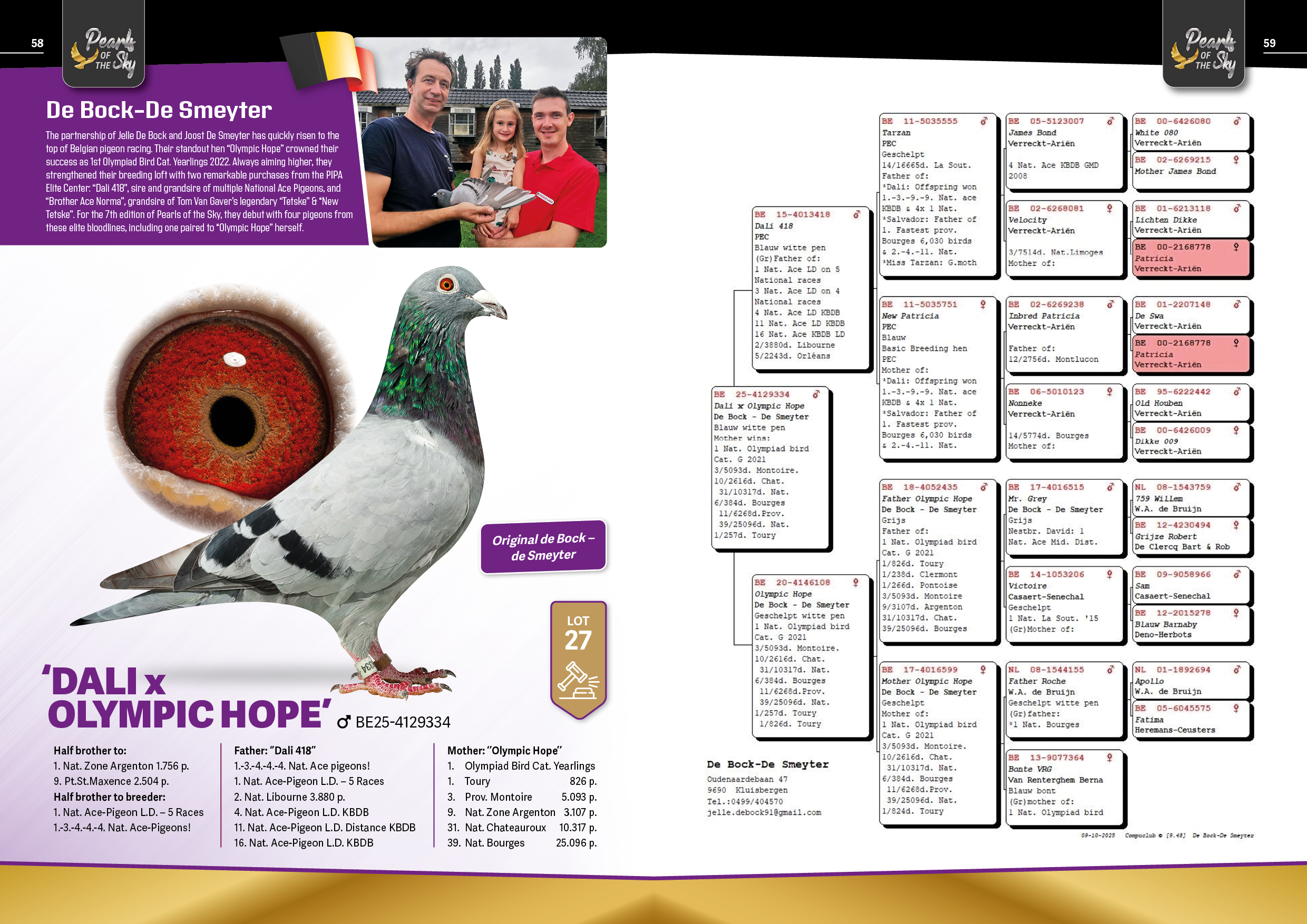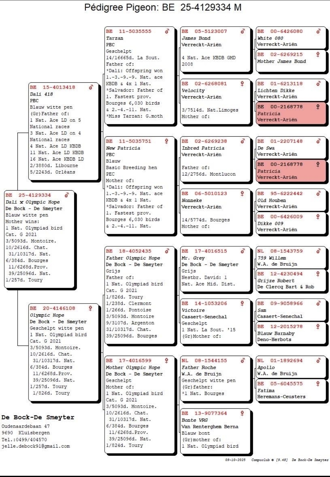 Uit: ”Dali 418”, gr-vader 1.-3.-4.-4.-4. Nat. Asduif, 2. Nat. Libourne 3.880 d. x ”Olympic Hope”, 1. Olympiade Cat. Jaarlingen, 1.-826 d., 3. Prov. 5.093 d., 9. Nat. Zone 3.107 d., 17.-2.118 d., 31. Nat. 10.317 d., 39. Nat. 25.096 d.