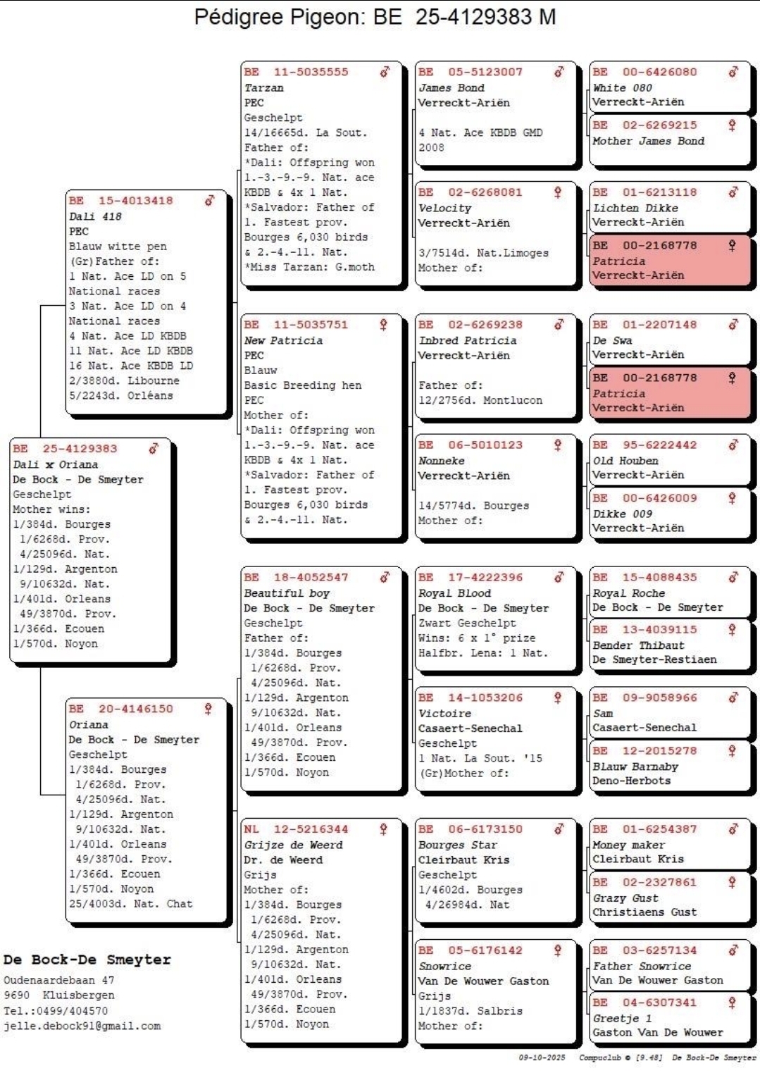 Uit: ”Dali 418”, gr-vader 1.-3.-4.-4.-4. Nat. Asduif, 2. Nat. Libourne 3.880 d., 5. Orleans 2.243 d. x ”Oriana”, 1. Prov. Bourges 6.286 d., 1. Noyon 570 d., 1. Ecouen 366 d., 4. Nat. Bourges 25.096 d., 9. Nat. Argenton 10.632 d.