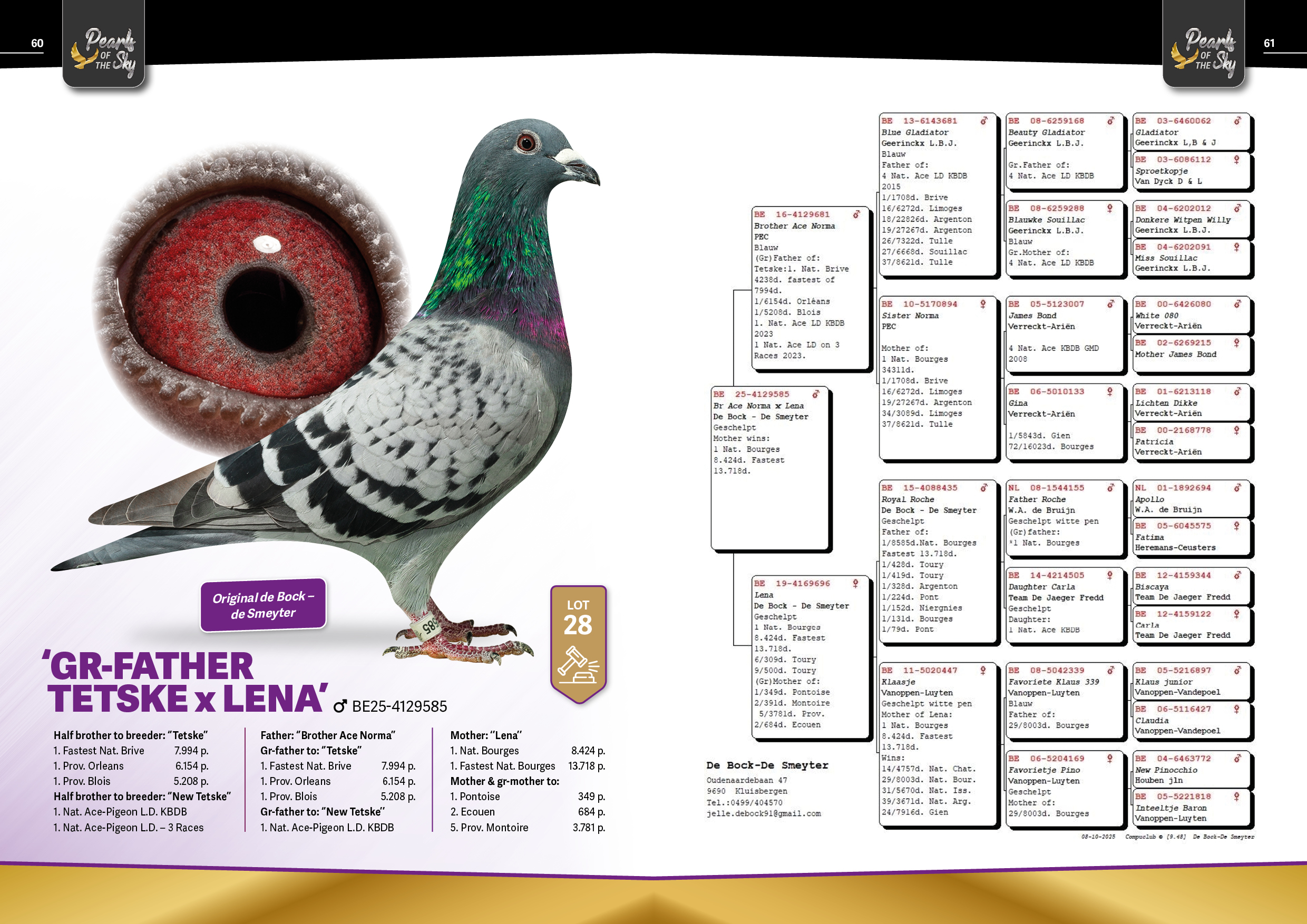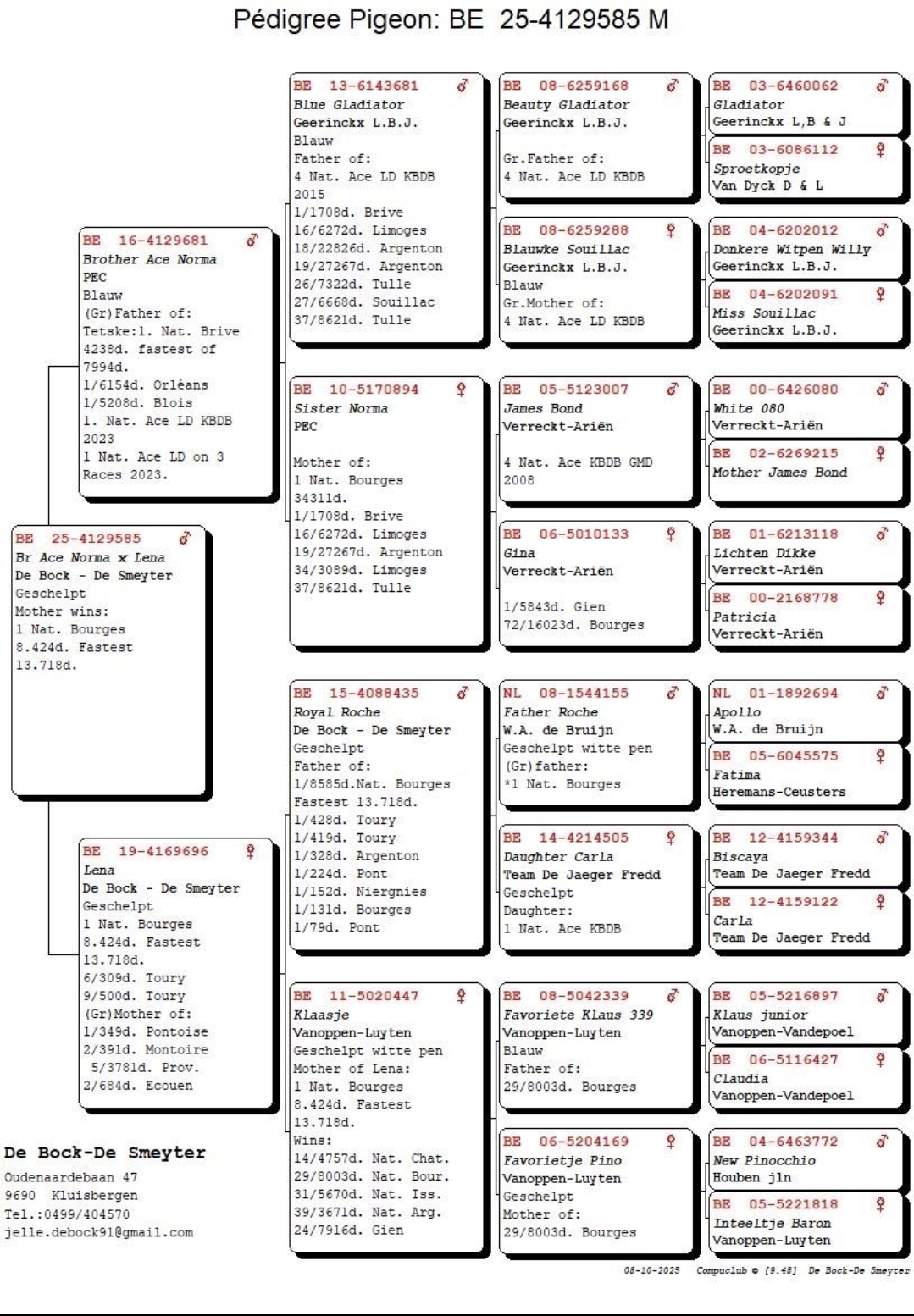 Uit: ”Brother Ace Norma”, gr-vader ”Tetske”, 1. Snelste Nat. Brive 7.994 d., 1. Prov. 6.154 d., 1. Prov. 5.208 d., gr-vader ”New Tetske”, 1. Nat. Asduif Fond KBDB x ”Lena”, 1. Snelste Nat. Bourges 13.718 d., 6.-309 d., 9.-500 d.