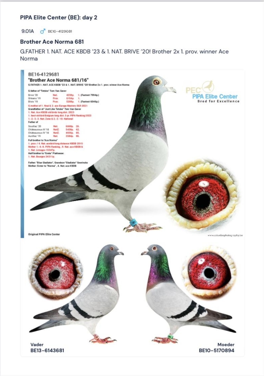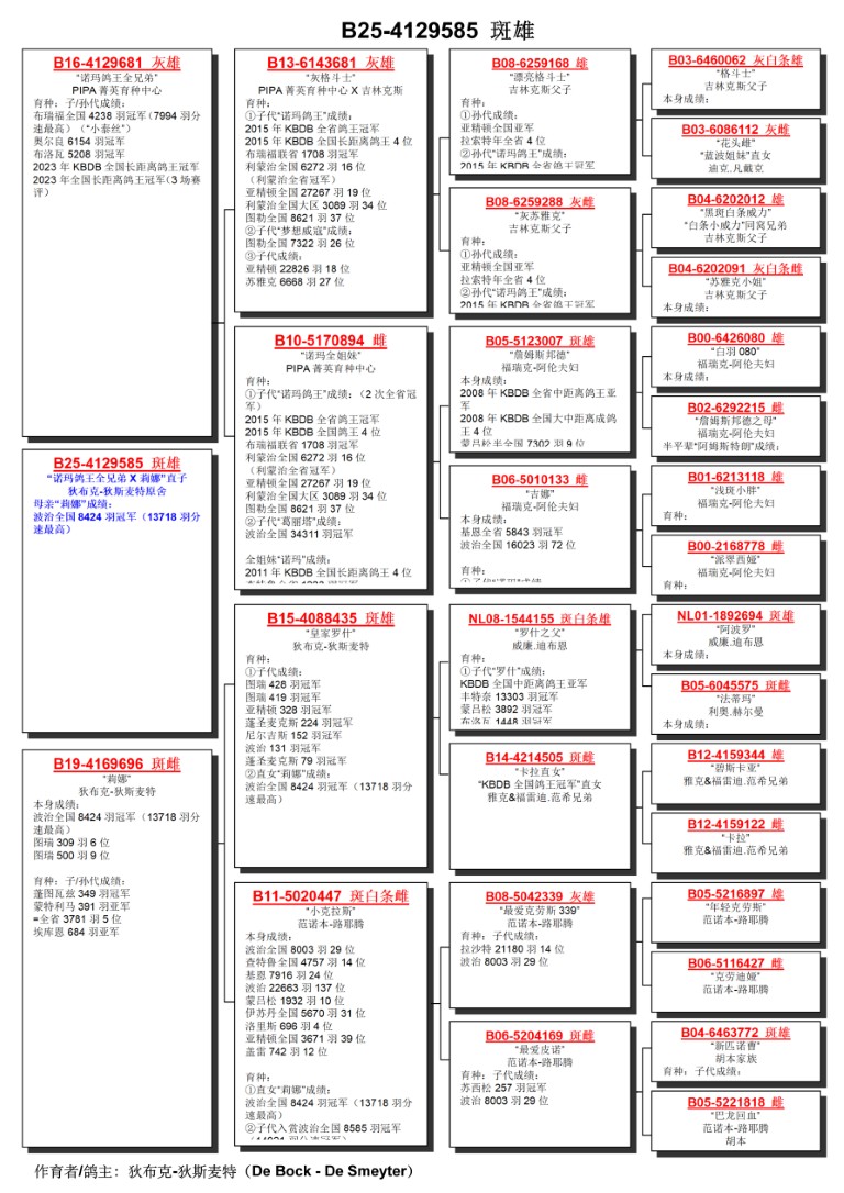 出自: ”诺玛鸽王全兄弟”, 作出孙代 ”小泰丝”, 布瑞福全国 7.994 羽速度最快, 1位省赛6.154 羽, 1位省赛 5.208 羽, 作出孙代 ‘新小泰丝”, KBDB全国长距离鸽王冠军 x ”莉娜”, 波治全国 13.718 羽速度最快, 6位-309 羽, 9位-500 羽