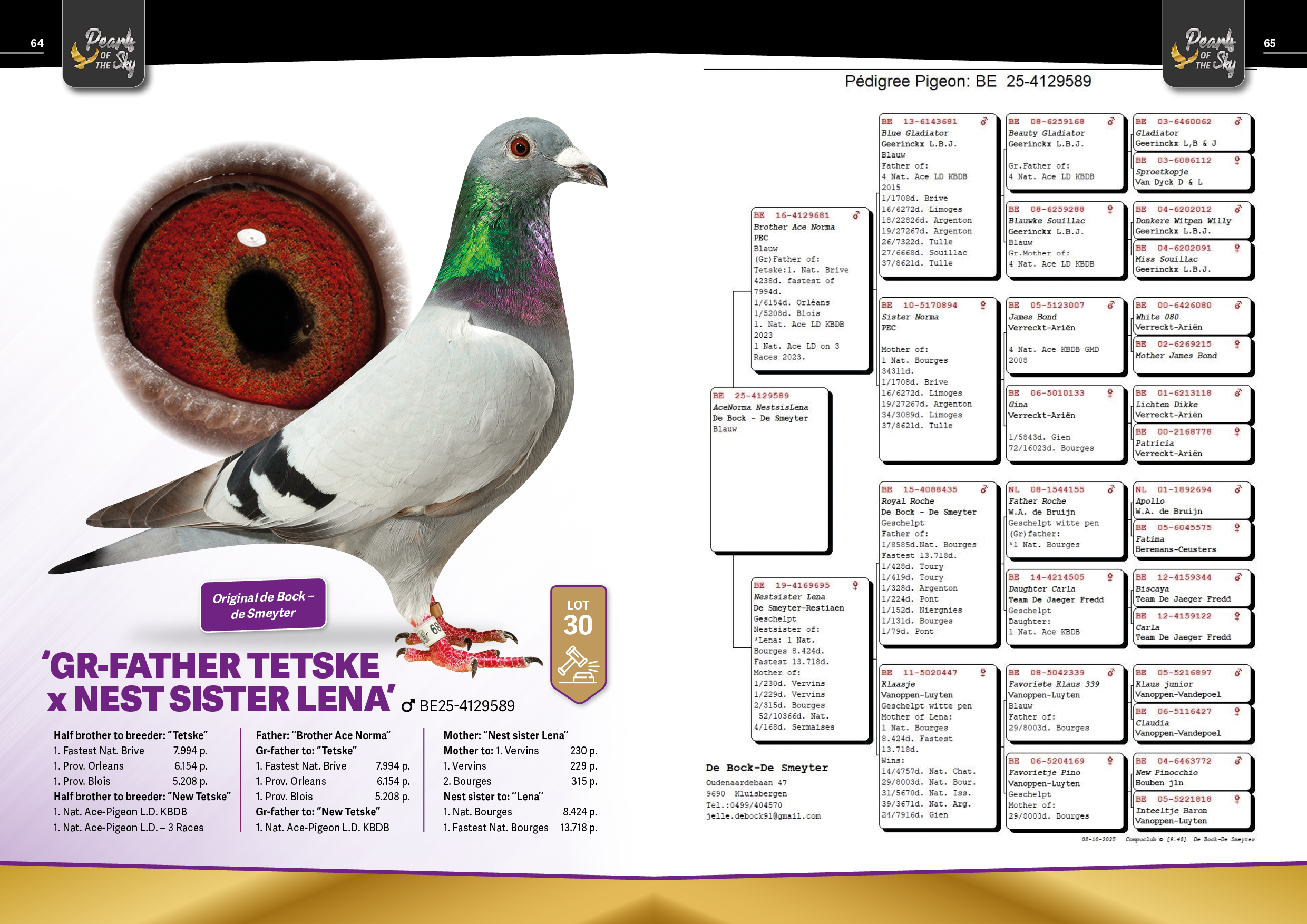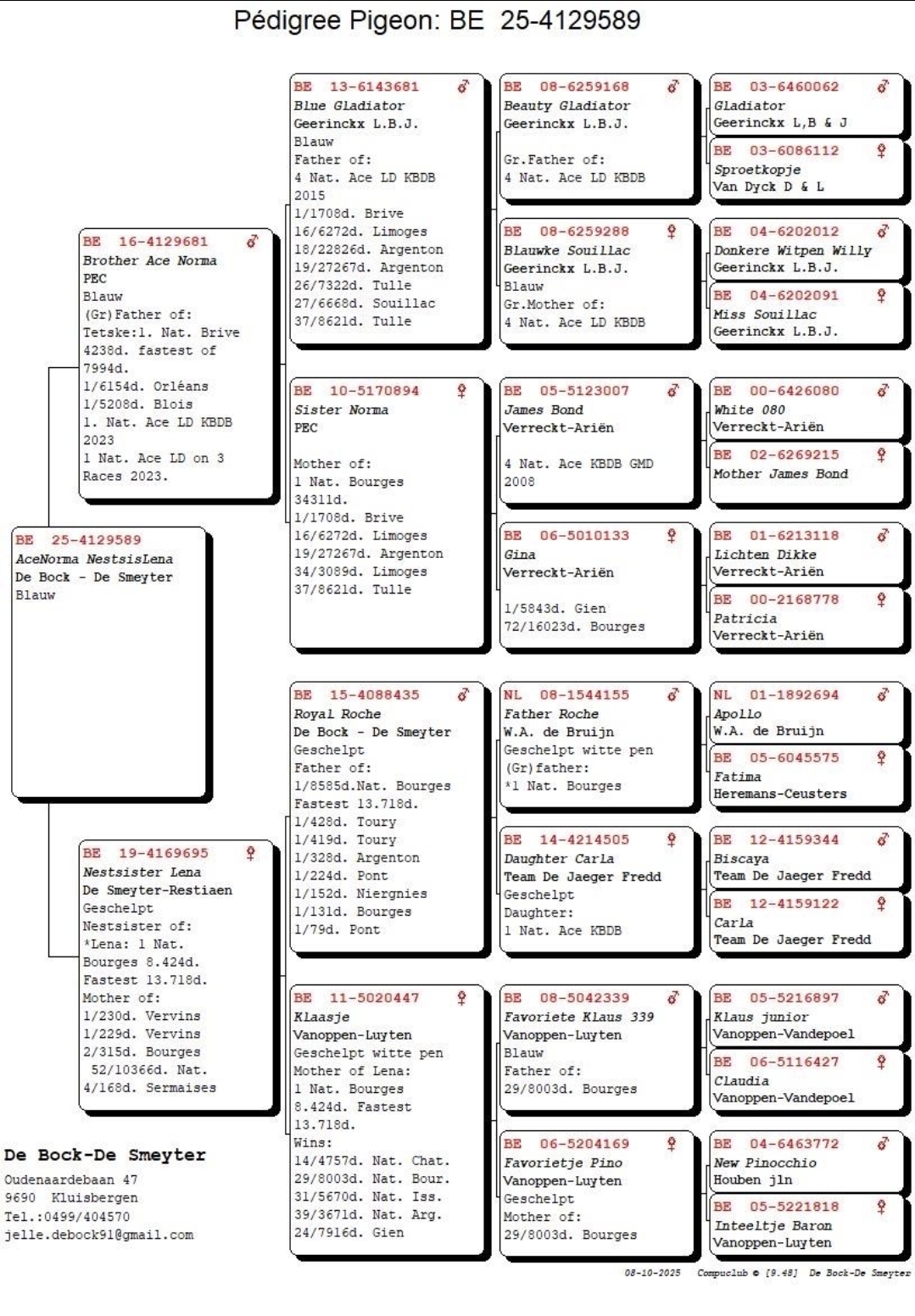 Uit: ”Brother Ace Norma”, gr-vader ”Tetske”, 1. Snelste Nat. Brive 7.994 d., 1. Prov. 6.154 d., 1. Prov. 5.208 d., gr-vader ”New Tetske”, 1. Nat. Asduif Fond KBDB x ”Nestsister Lena”, moeder 2x 1. Prijs, nestzus ”Lena”, 1. Nat. Bourges