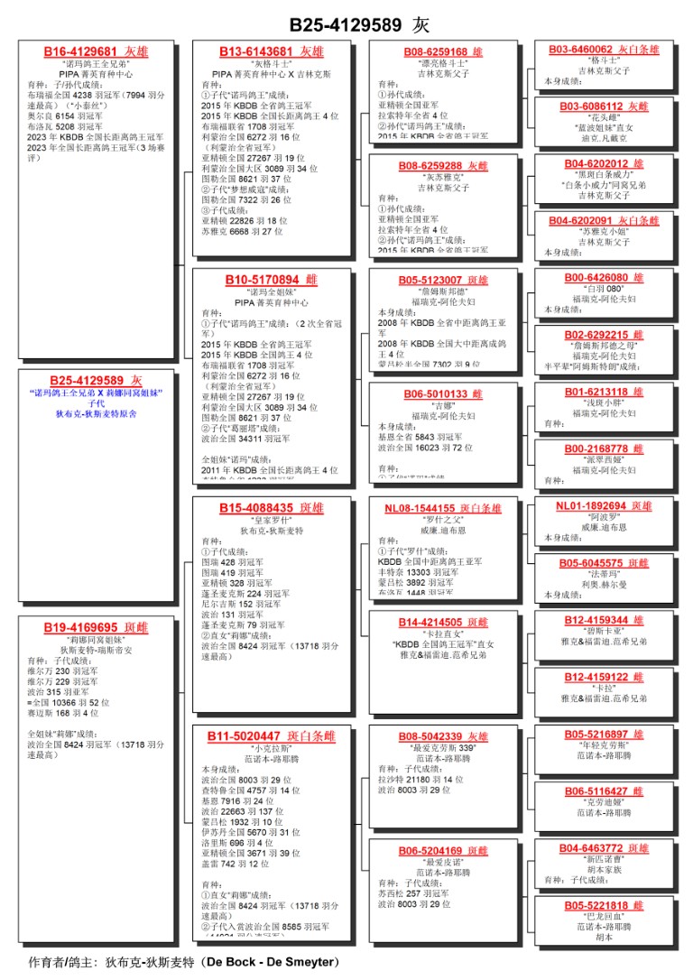 出自: ”诺玛鸽王全兄弟”, 作出孙代 ”小泰丝”, 布瑞福全国 7.994 羽速度最快, 1位省赛6.154 羽, 1位省赛 5.208 羽, 作出孙代 ”新小泰丝”, KBDB全国长距离鸽王冠军 x ”莉娜同窝姐妹”, 作出子代 2次冠军, 同窝姐妹 ”莉娜”, 波治全国冠军