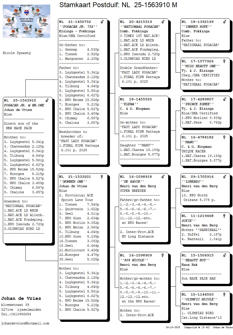 Uit: ”Pogacar Jr.”, vader 3.-3.-4.-4.-5.-5.-6.-7.-8.-8.-9.-9.-etc. tegen gemiddeld 6.000 d., gr-vader 1.-4.538 d., 1.-2.528 d., 1.-2.235 d., zoon ”Nationaal Pogacar” x ”Number One”, 2. Prov. Asduif, 1.-7.540 d., 1.-1.622 d.
