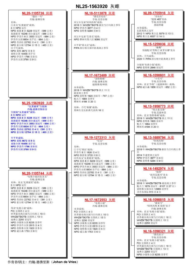 出自: ”强壮一号”, 作出子代 ”瓦莱丽亚”, 1位 NPO 基恩 5.229 羽, 1位省联赛 基恩 10.246 羽, 1位NPO 伊苏丹 3.553 羽, 4位NPO 苏西松 22.782 羽, 15位NPO 索尔顿 12.794 羽 x ”电视小姐回血直女”, 作出子代 ”瓦莱丽亚”, 2次 NPO冠军