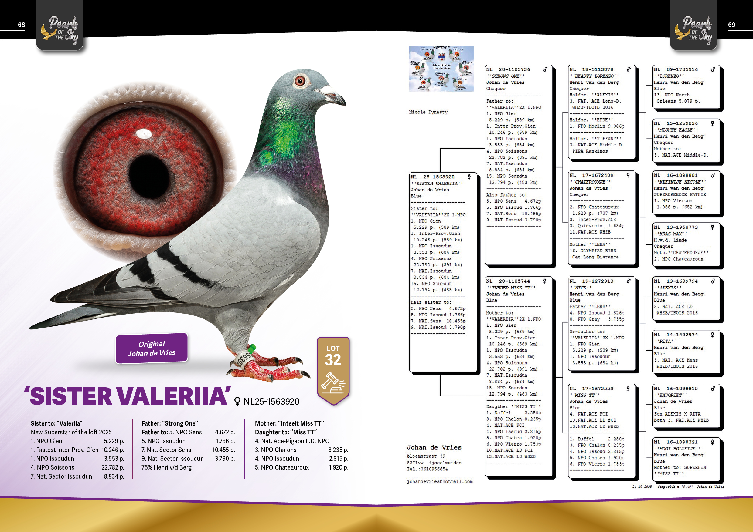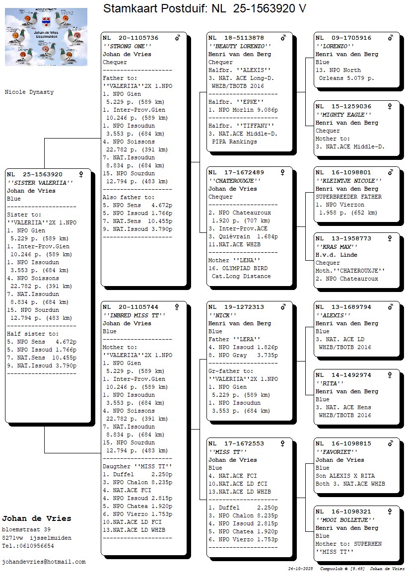 Uit: ”Strong One”, vader ”Valeriia”, 1. NPO Gien 5.229 d., 1. Inter-Prov. Gien 10.246 d., 1. NPO Issoudun 3.553 d., 4. NPO Soissons 22.782 d., 15. NPO Sourdun 12.794 d. x ”Inbred Miss TT”, moeder ”Valeriia”, 2x 1. NPO
