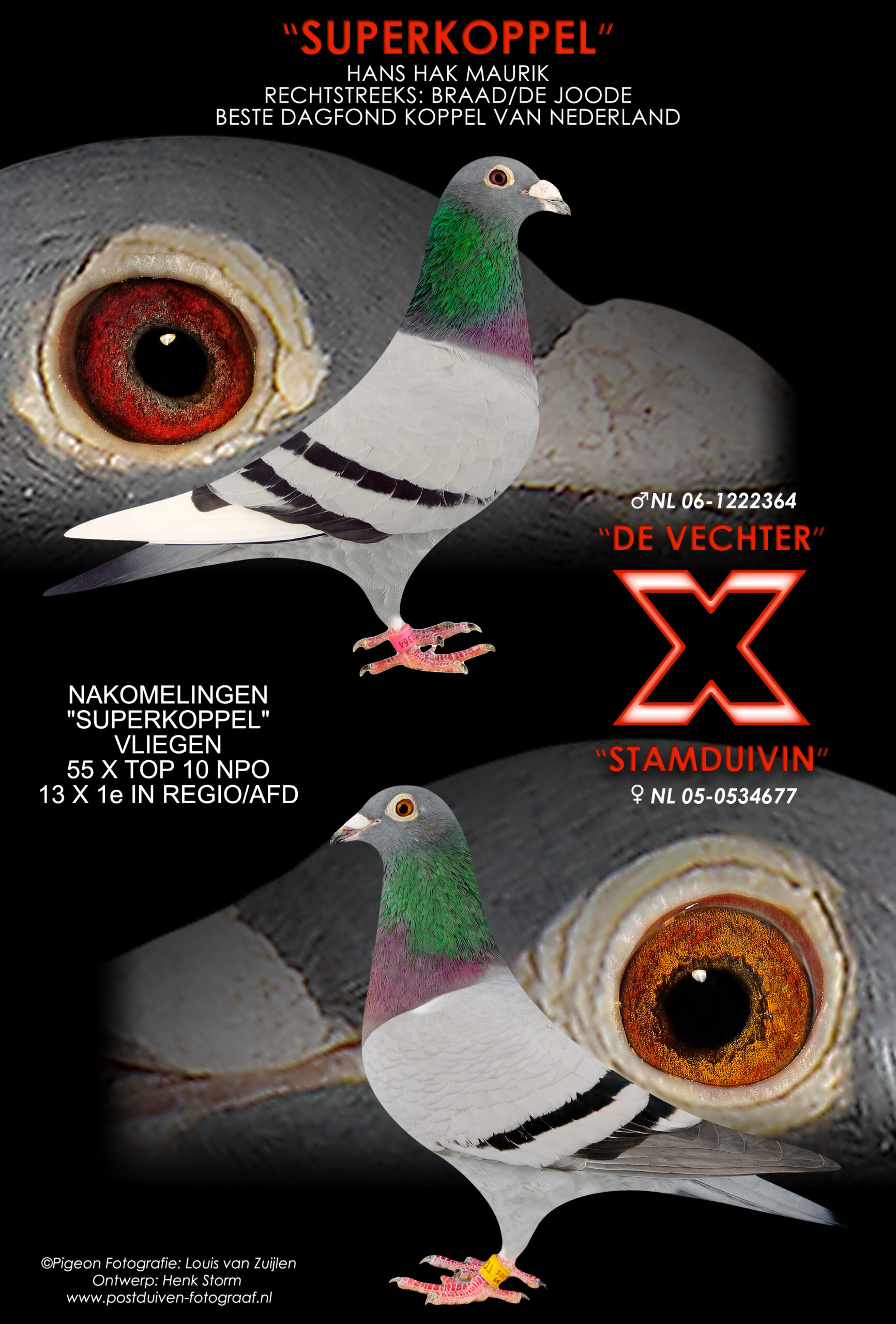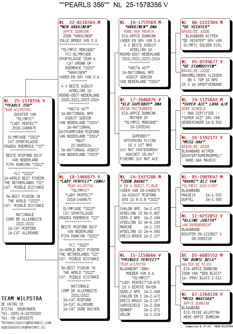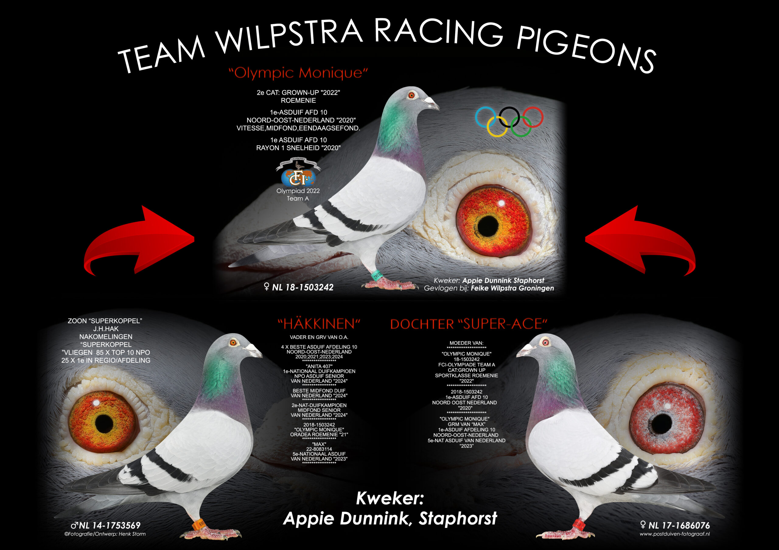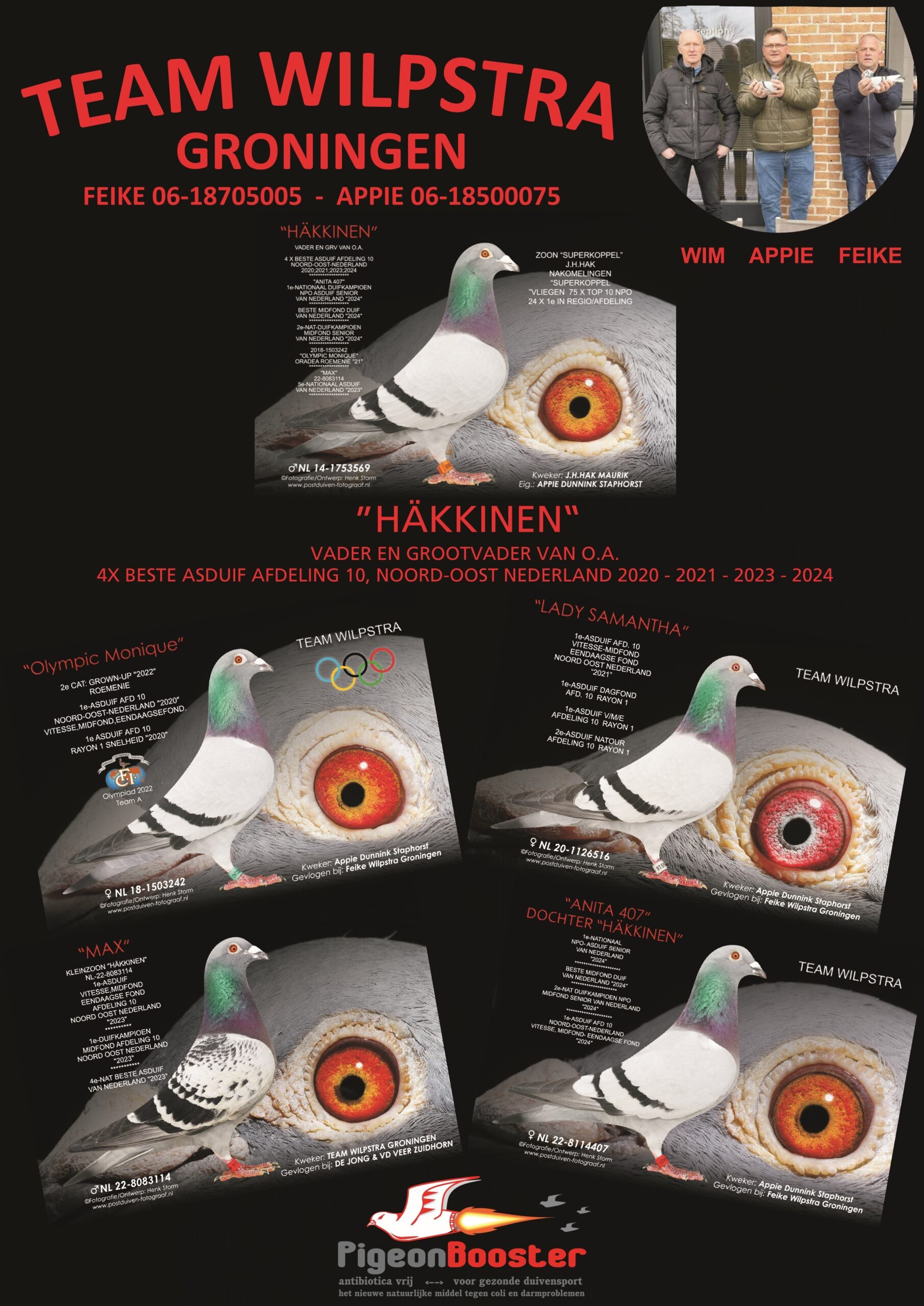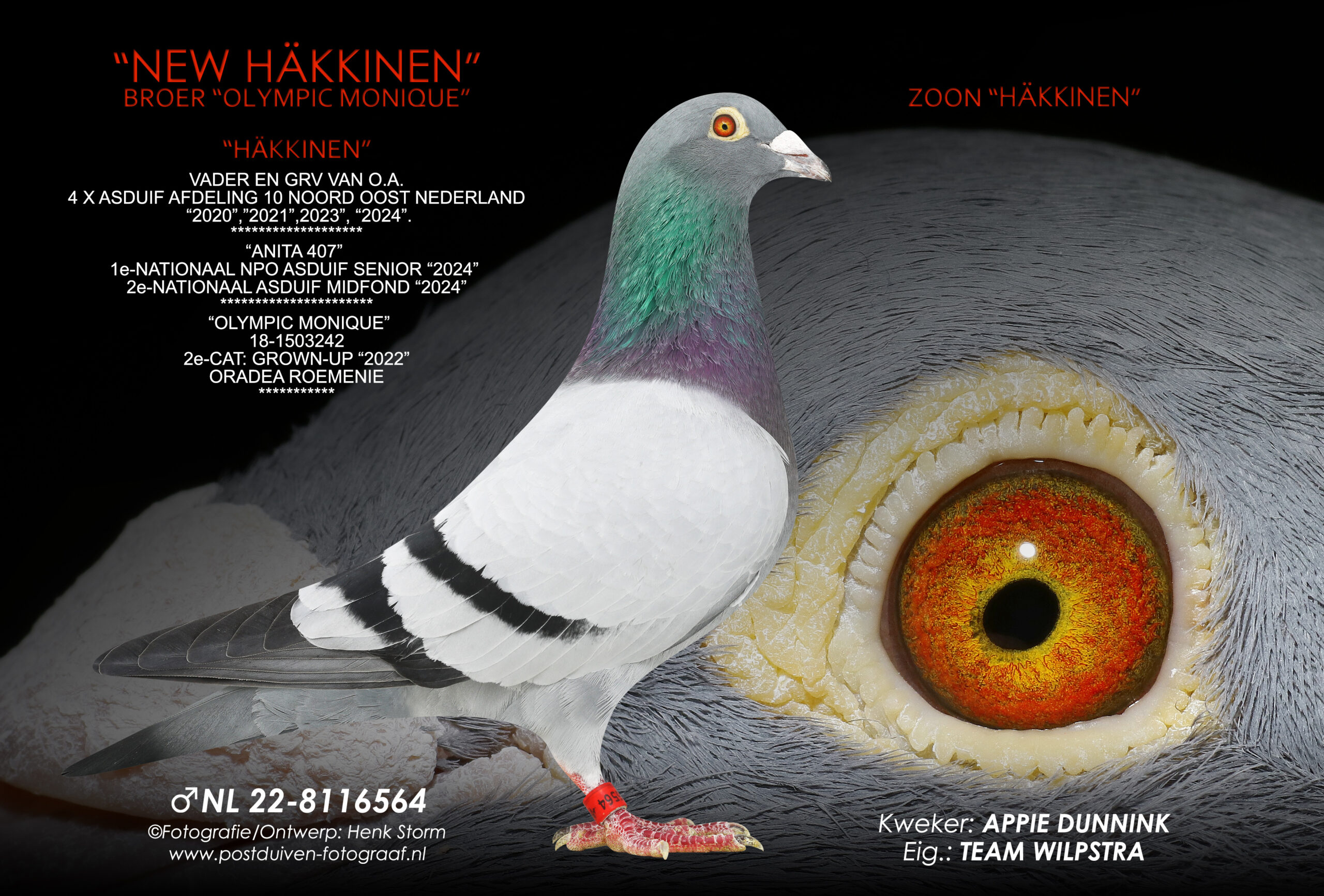 Uit: ”New Häkkinen”, zoon ”Häkkinen”, vader & gr-vader 4x 1. Prov. Asduif Allround, 1. Nat. Asduif Allround NPO x ”Olympic Lady Perfect”, 3x 1. Nat. Asduif Midfond, 1. Nat. Asduif Allround, 1. Nat. Asduif Oude Duiven