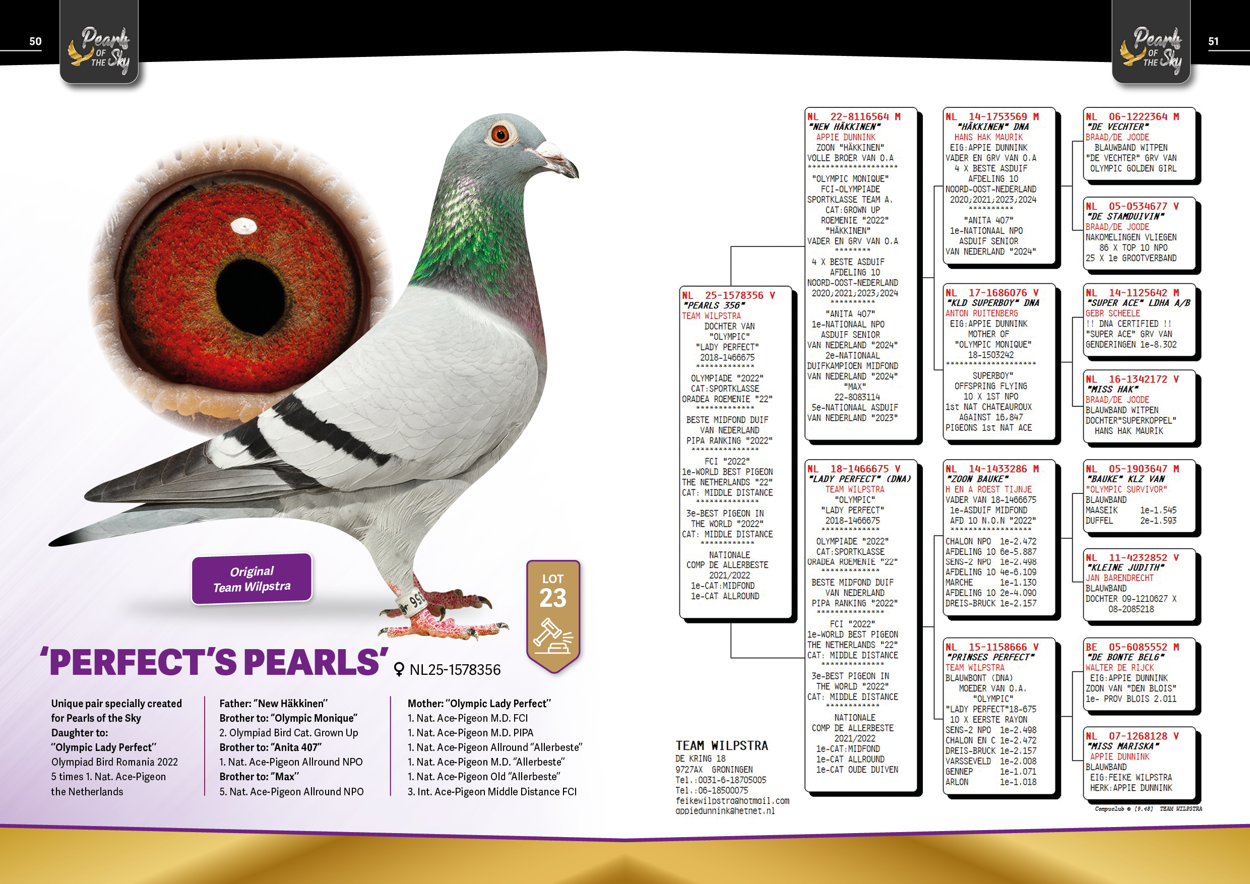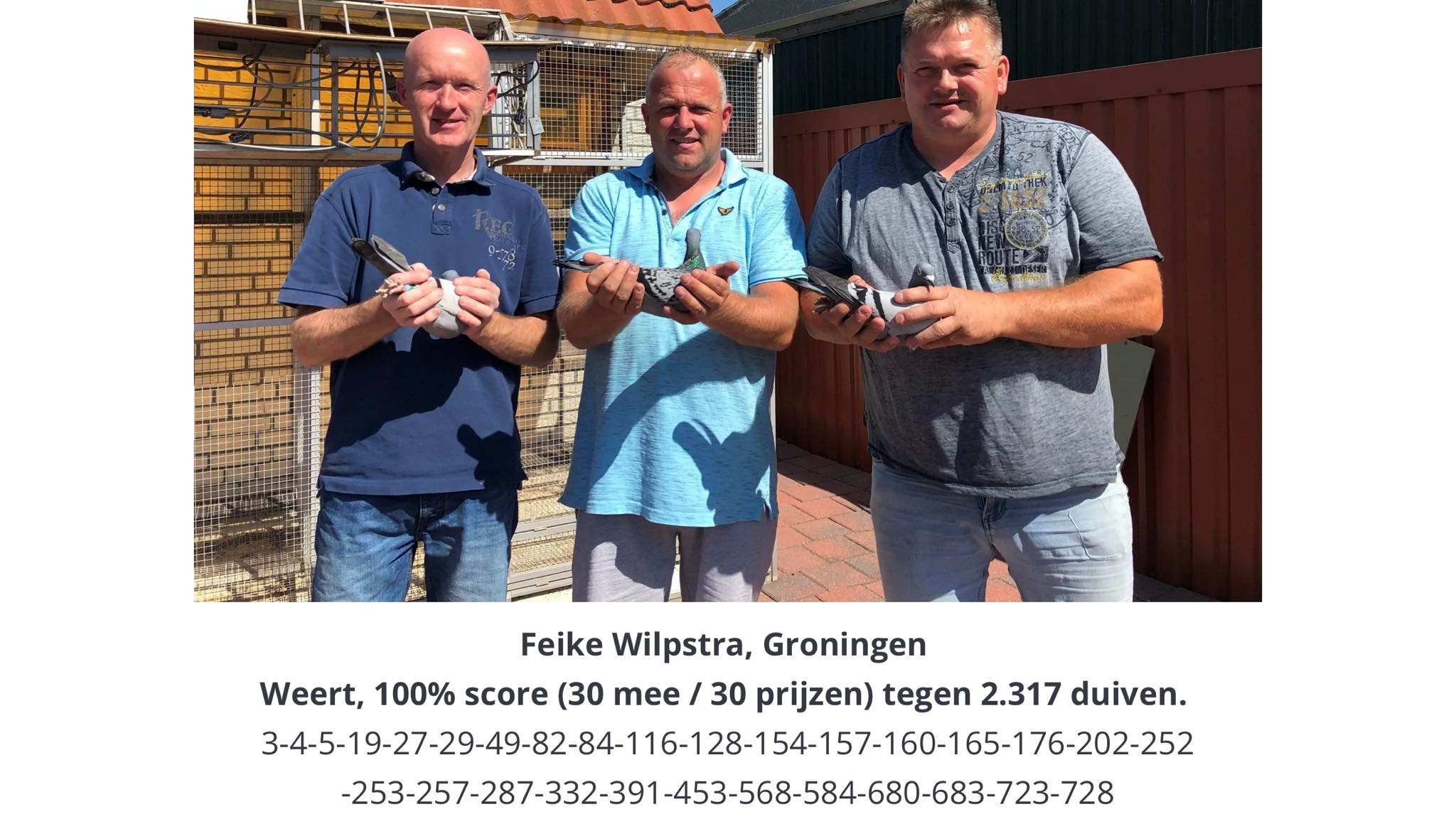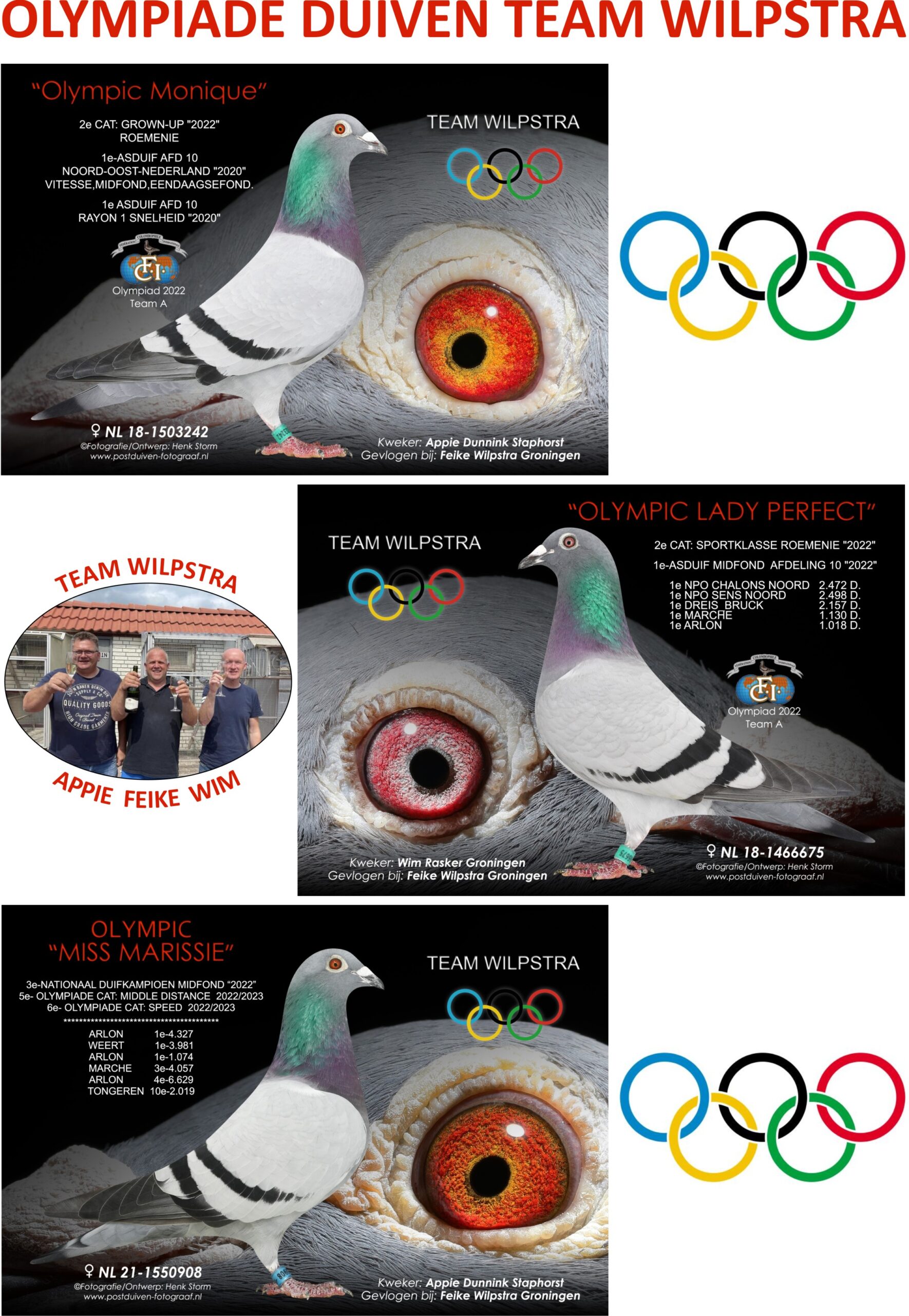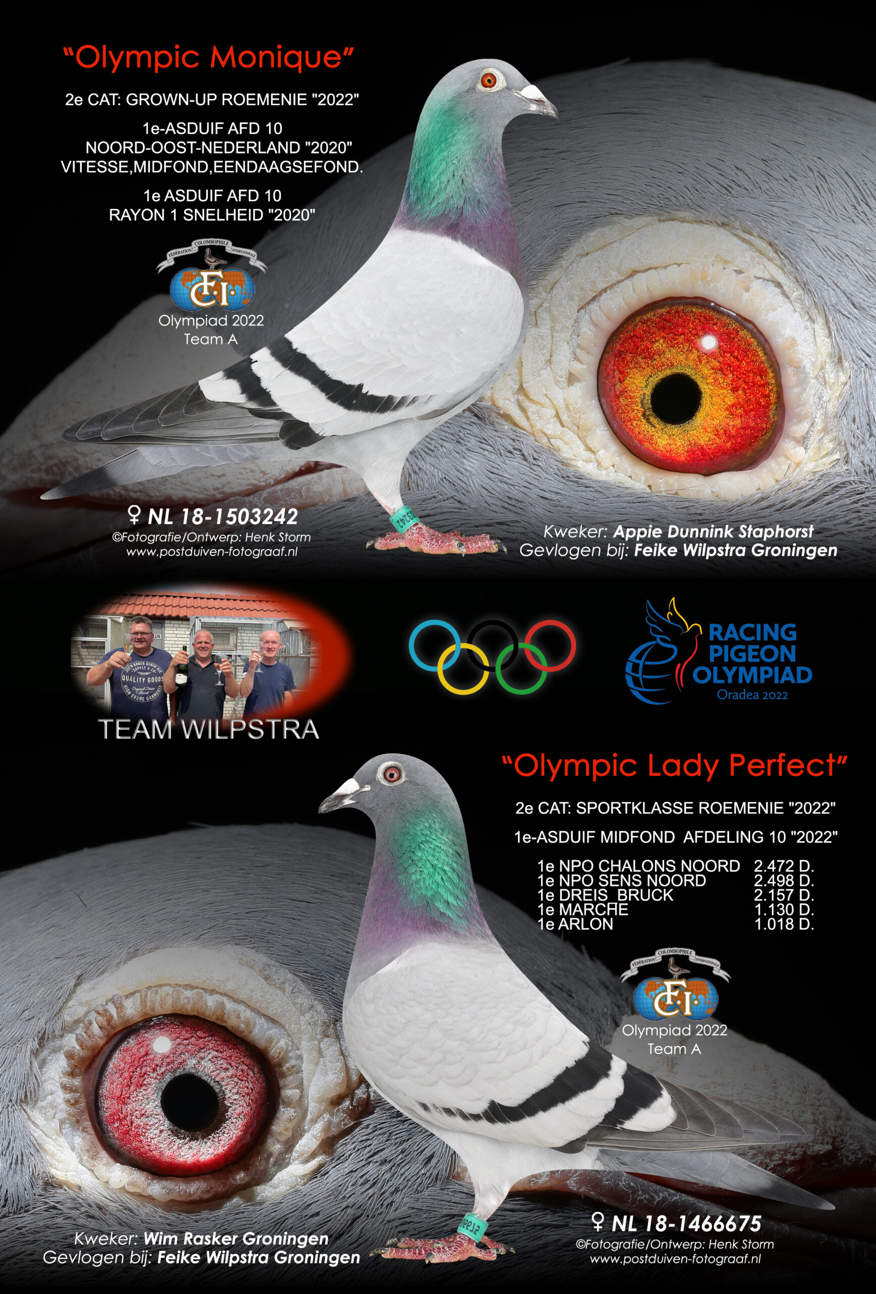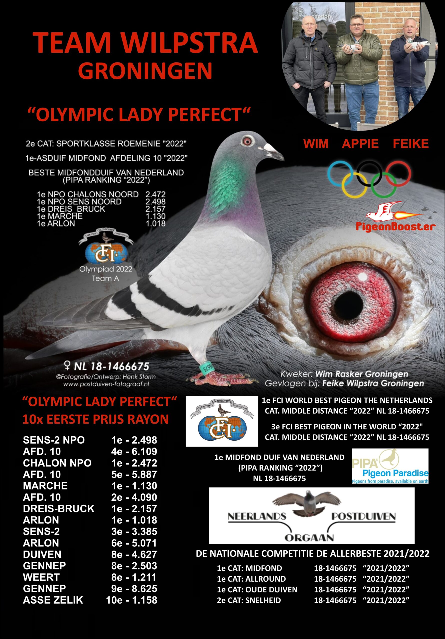 Uit: ”New Häkkinen”, zoon ”Häkkinen”, vader & gr-vader 4x 1. Prov. Asduif Allround, 1. Nat. Asduif Allround NPO x ”Olympic Lady Perfect”, 3x 1. Nat. Asduif Midfond, 1. Nat. Asduif Allround, 1. Nat. Asduif Oude Duiven