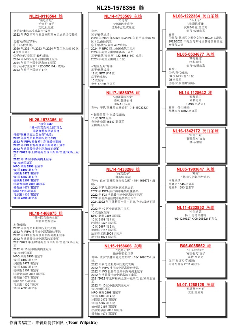 出自: ”新哈奇尼”, ”哈奇尼”儿子, 作出子代 & 孙代: 4次省赛全能鸽王冠军, NPO 全国全能鸽王冠军x ”奥林匹克完美女郎”, 3次全国中距离鸽王冠军, 全国全能鸽王冠军, 全国成鸽鸽王冠军