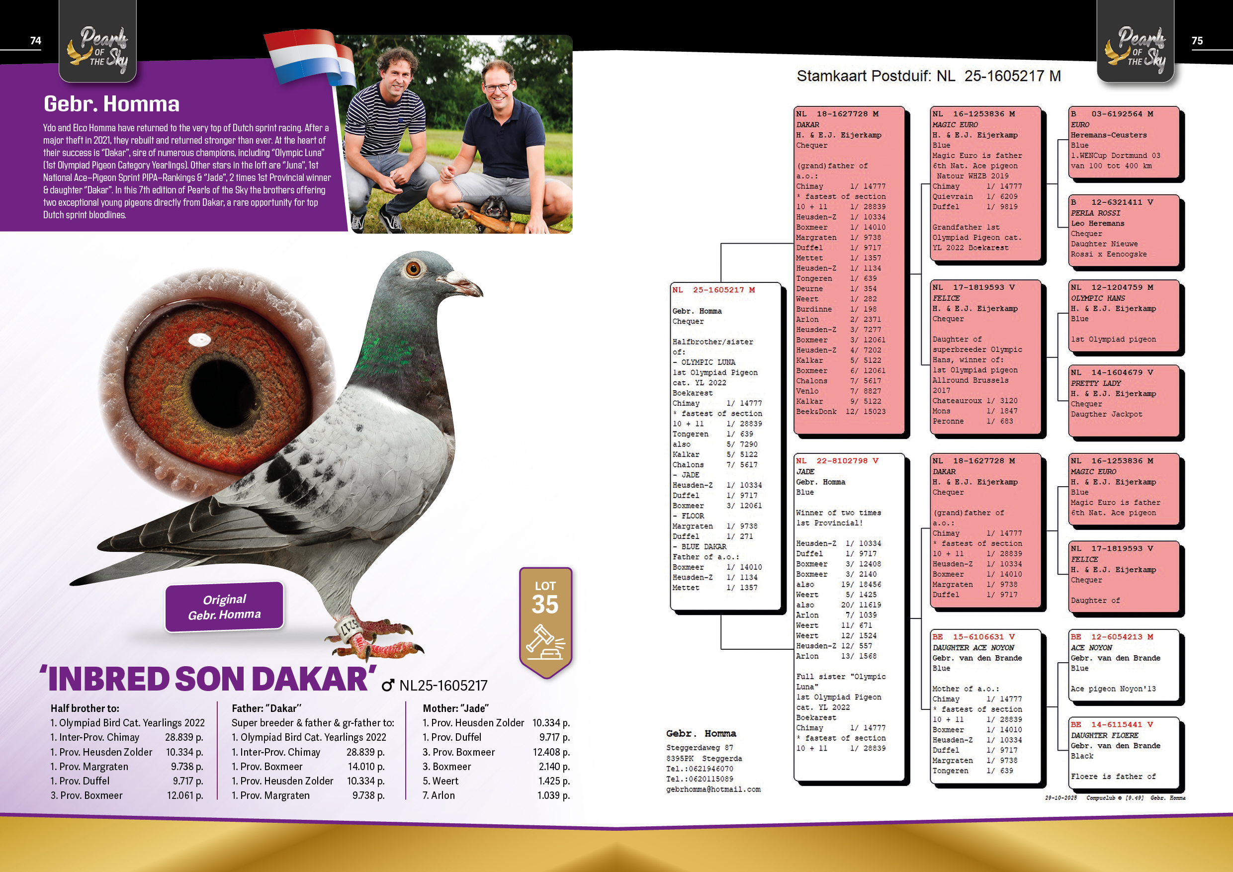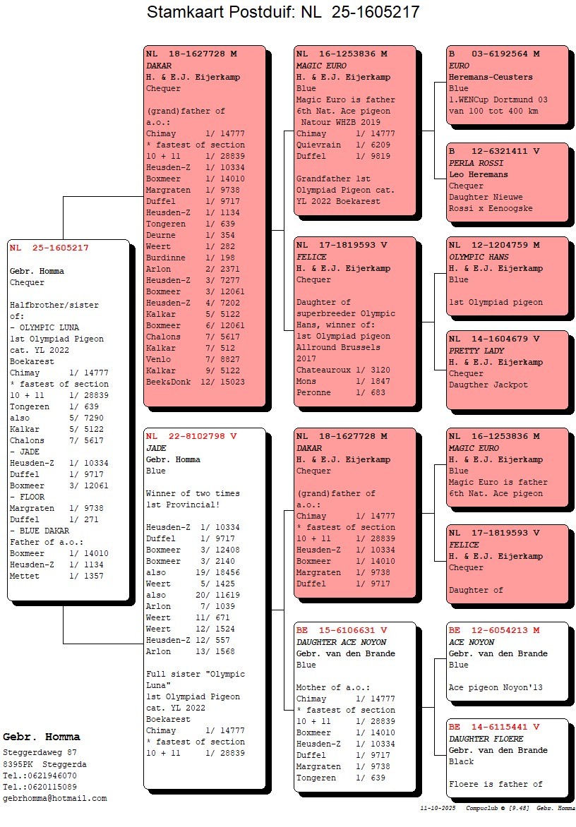 Uit: ”Dakar”, vader & gr-vader 1. Olympiade duif Cat. Jaarlingen, 1.-28.839 d., 1.-14.010 d., 1.-10.334 d., 1.-9.738 d., 1.-9.717 d. x ”Jade”, 1. Prov. Heusden 10.334 d., 1. Prov. Duffel 9.717 d., 3. Prov. 12.408 d., dochter ”Dakar”