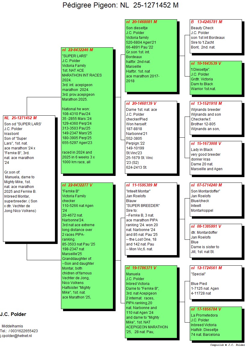 出自: ”超级拉尔斯”, 2024年马拉松全国鸽王冠军, 拉松国际鸽王季军, 35位全国马赛 , 108位全国波城 , 129位全国波品纳, 149位全国马赛 x ”芬克B”, PIPA排行榜全国超长距离马拉松鸽王季军, 20位全国拿邦