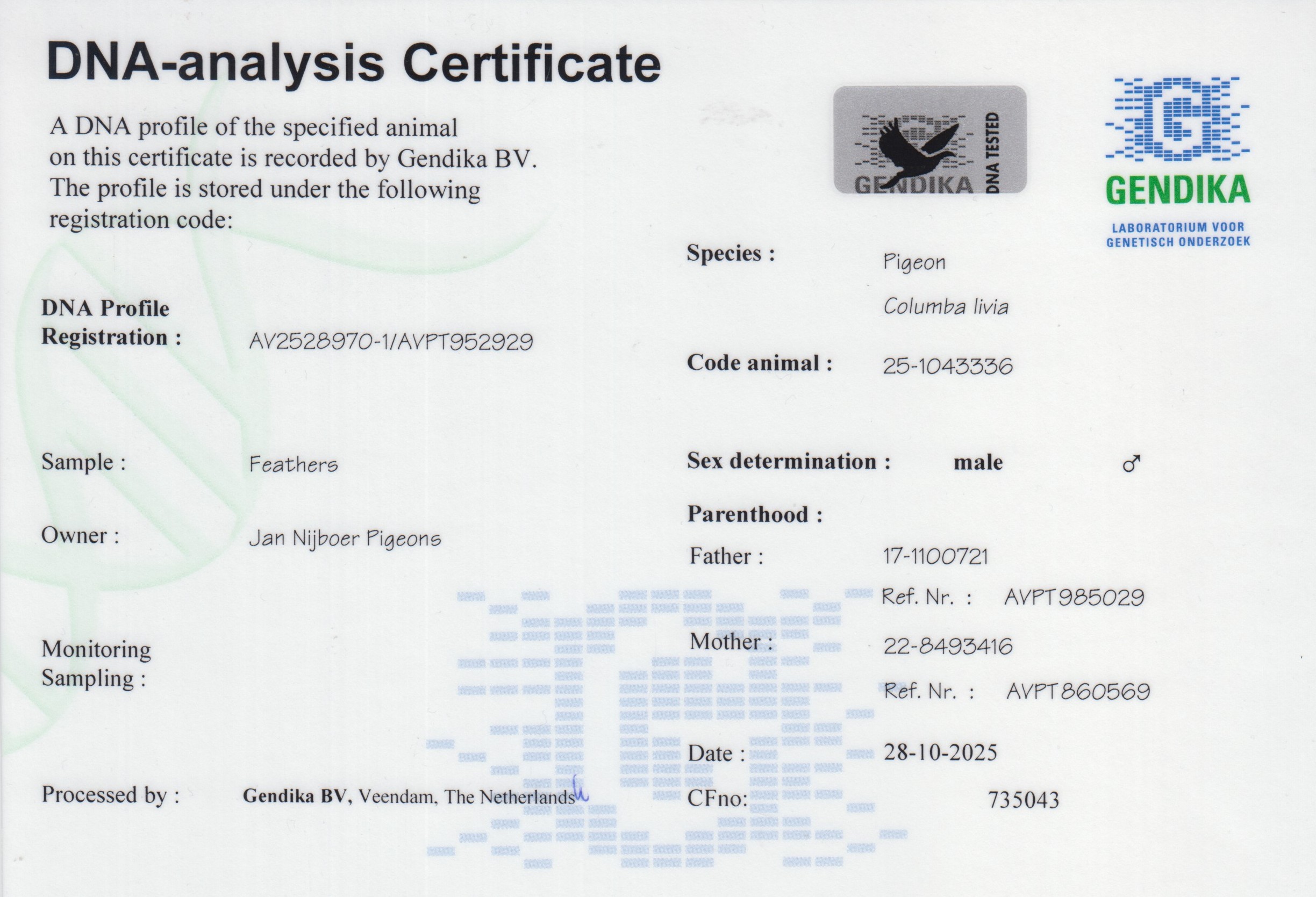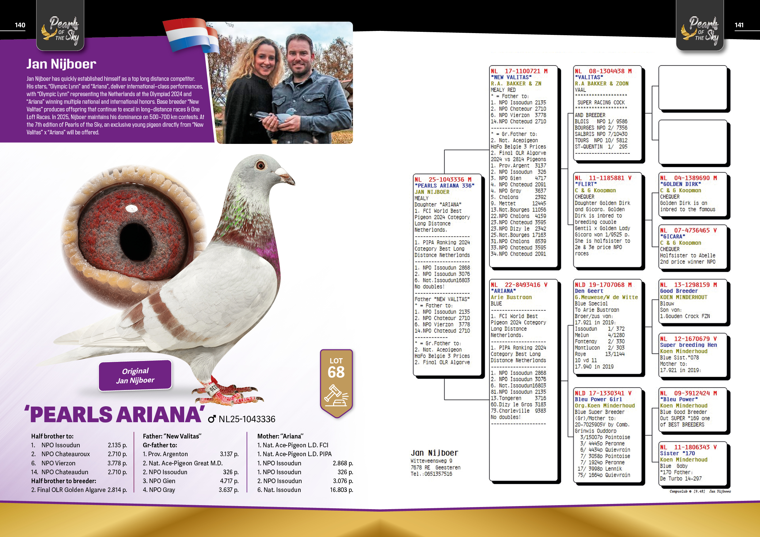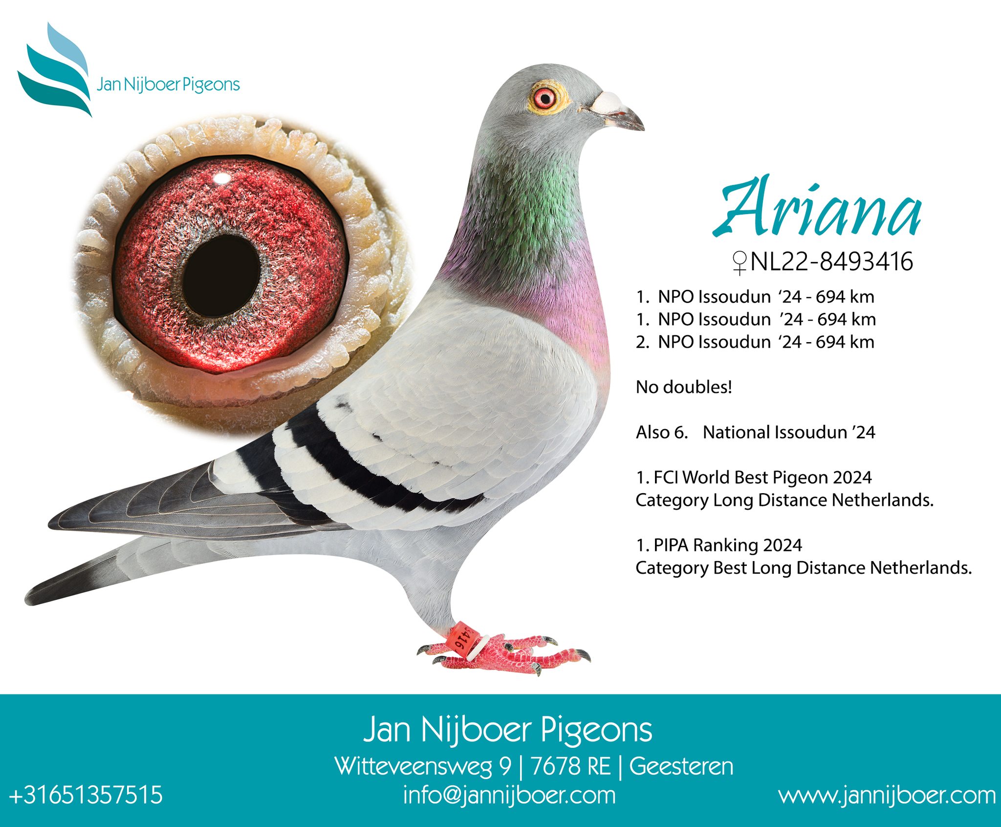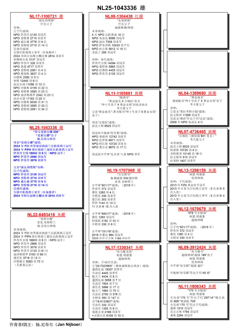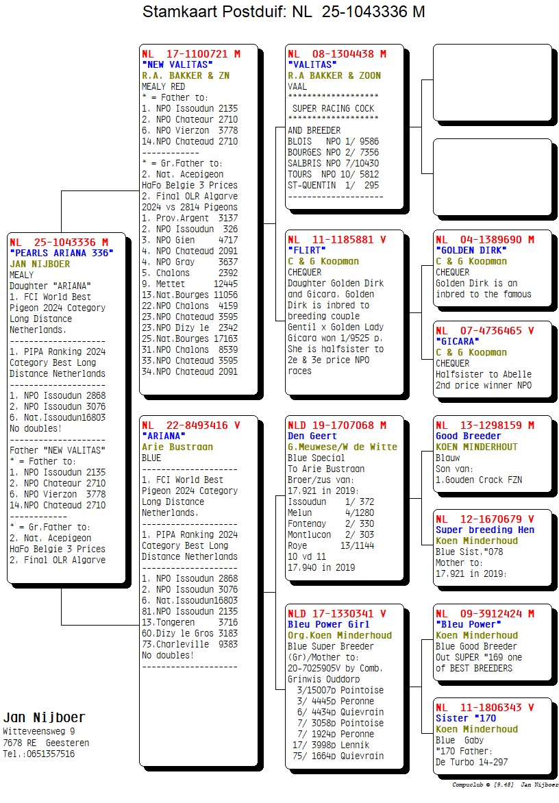 出自: ”新瓦利塔斯”, 作出子代: 1位-2位-6位NPO, 作出孙代: 全国鸽王亚军 , 1位-2位-3位-4位-4位等等 NPO/省赛, 2位阿尔加维公棚决赛x ”爱莉安娜”, FCI世界最佳鸽荷兰鸽王冠军, PIPA排行榜荷兰鸽王冠军, 1位 NPO伊苏丹, 1位NPO 伊苏丹, 2位 NPO 伊苏丹