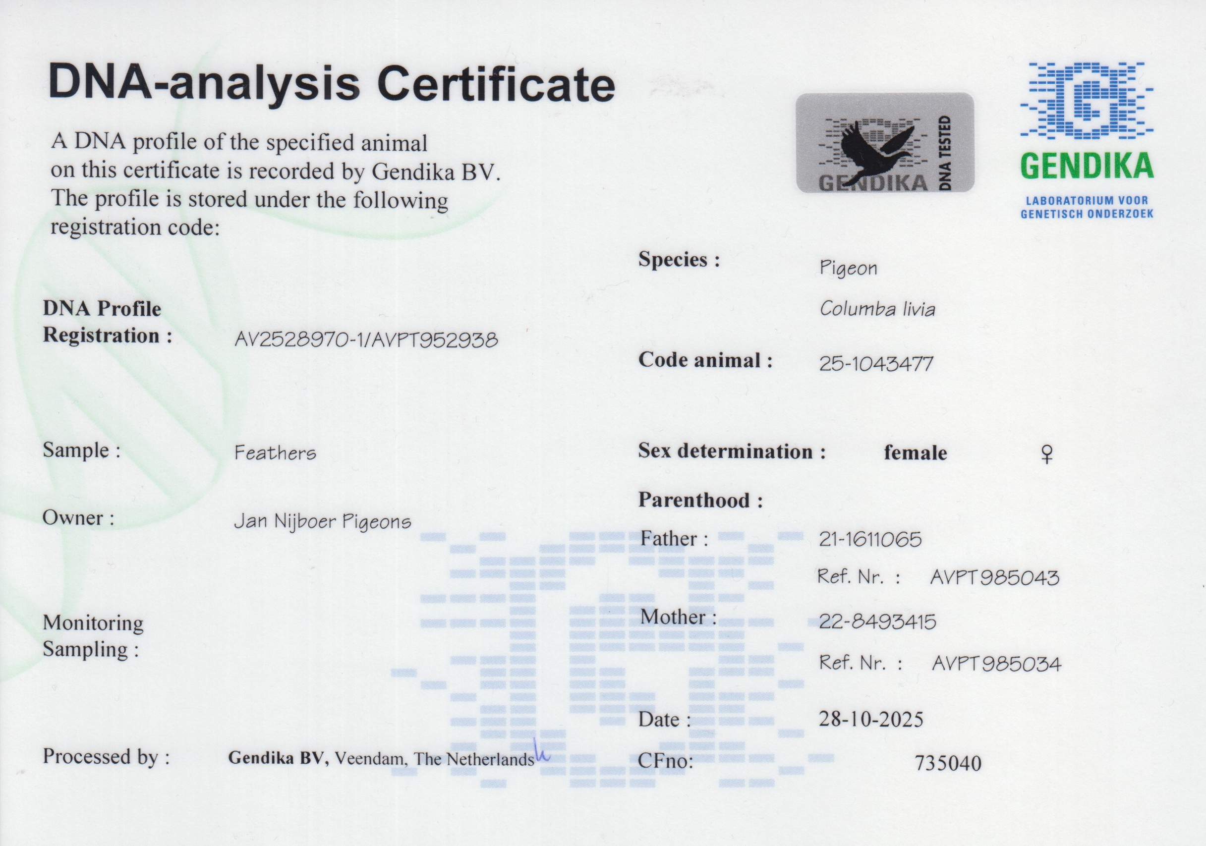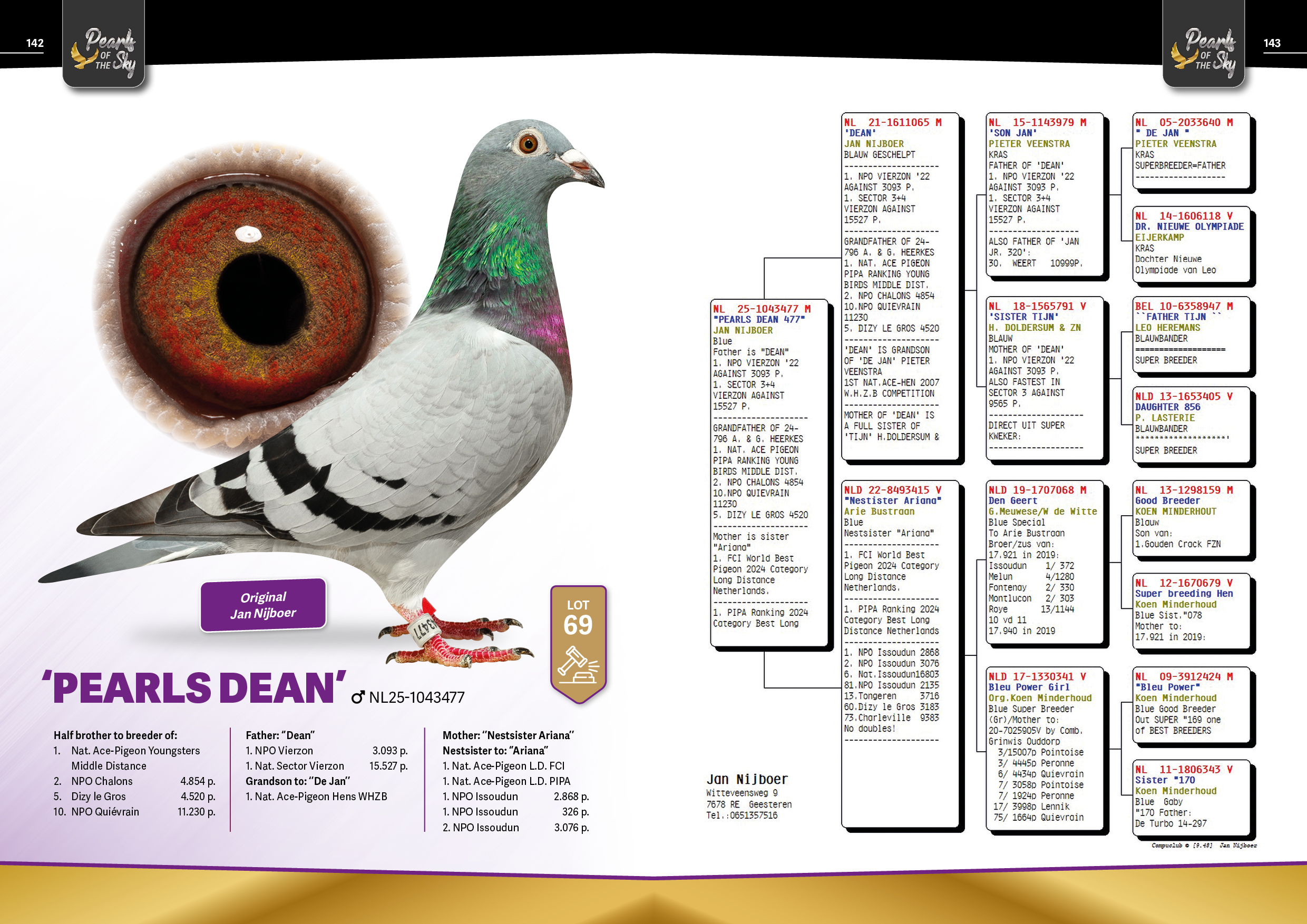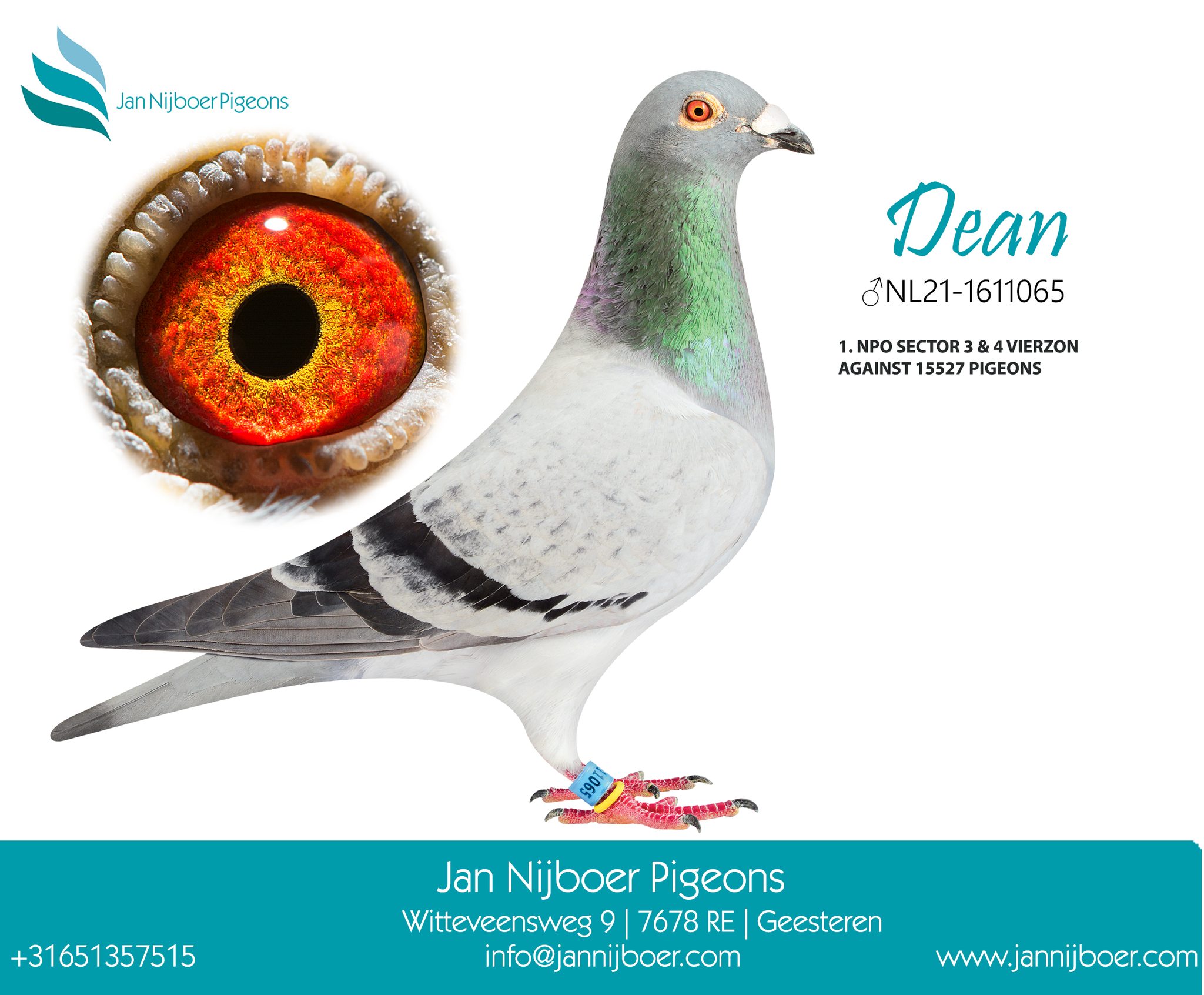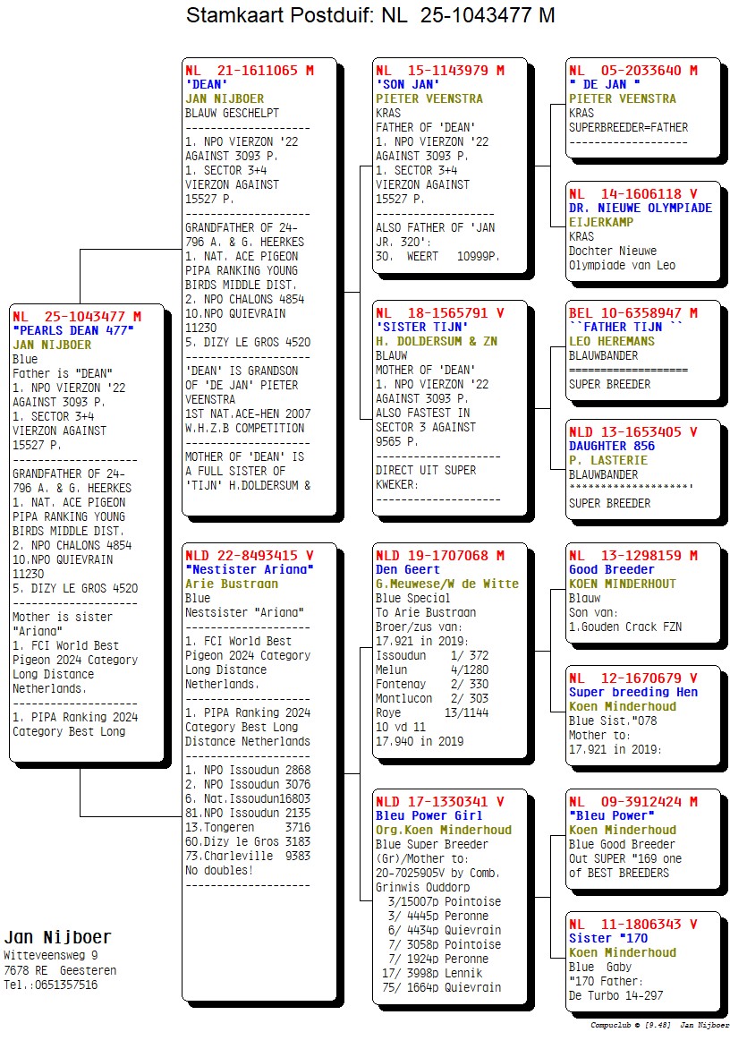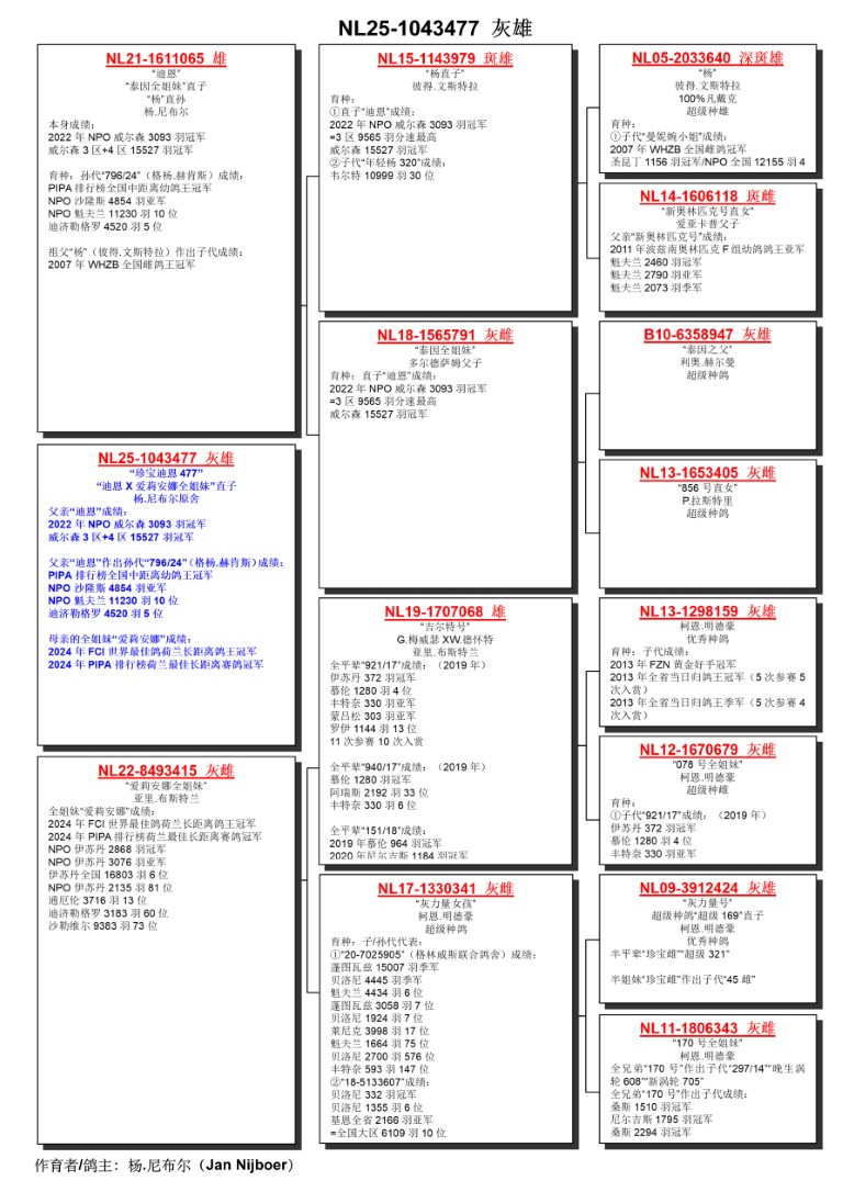 出自: ”迪恩”, 1位全国威尔森 15.527 羽, 作出孙代: PIPA排行榜全国中距离幼鸽王冠军 x”爱莉安娜同窝姐妹”, 同窝姐妹”爱莉安娜”, FCI世界最佳鸽荷兰长距离鸽王冠军, PIPA排行榜荷兰最佳长距离赛鸽冠军, 1位-1位-2位 NPO 伊苏丹2024