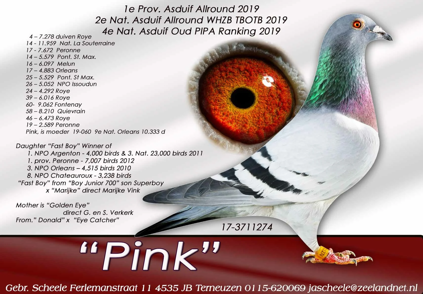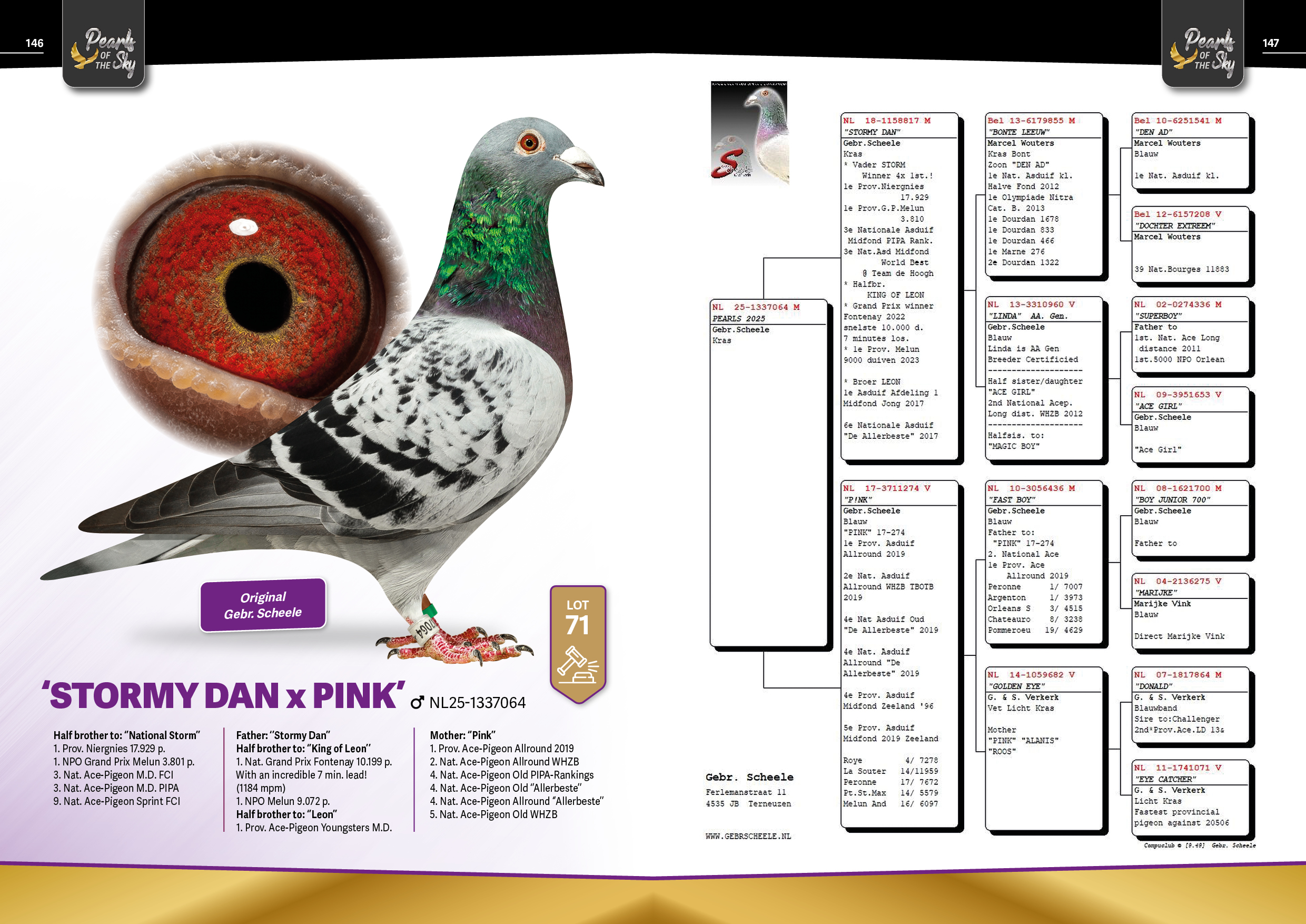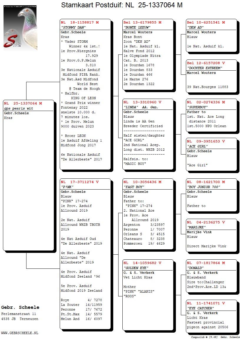 Uit: ”Stormy Dan”, vader ”Storm”, 1. Prov. 17.929 d., 1. NPO 3.810 d., 3. Nat. Asduif Midfond, 9. Nat. Asduif Vitesse x ”Pink”, 2.-4.-4.-4.-5.-etc. Nat. Asduif & 1. Prov. Asduif Allround, 4. Prov. 7.287 d., 14. Nat. 11.959 d., 17. NPO 4.883 d.