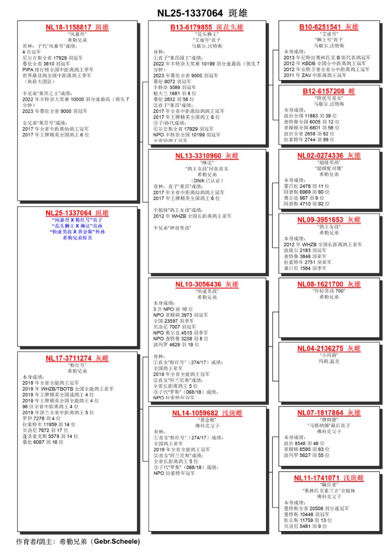 出自: ”风暴丹”, 作出子代 ”风暴号”, 1位省赛 17.929 羽, 1位NPO 3.810 羽, 全国中距离鸽王3位, 全国速度鸽王9位 x ”粉红号”,全国鸽王2位-4位-4位-4位-5位等等& 省赛全能鸽王冠军, 4位省赛7.287 羽, 14位全国11.959 羽, 17位 NPO 4.883 羽