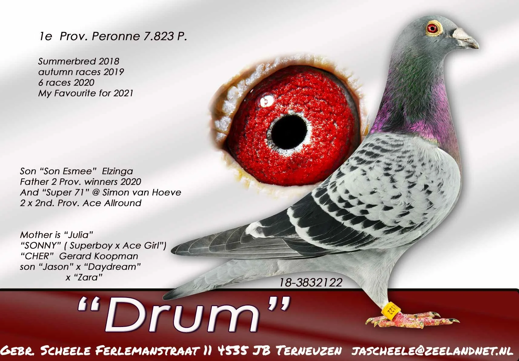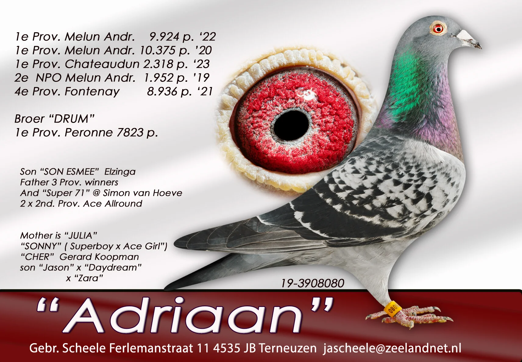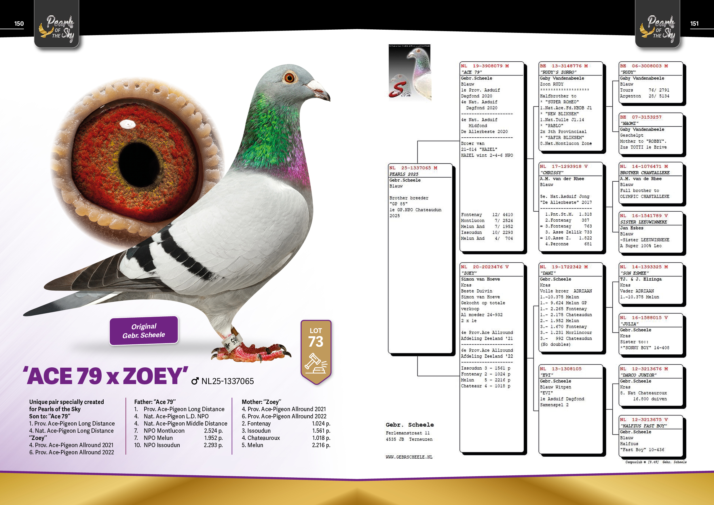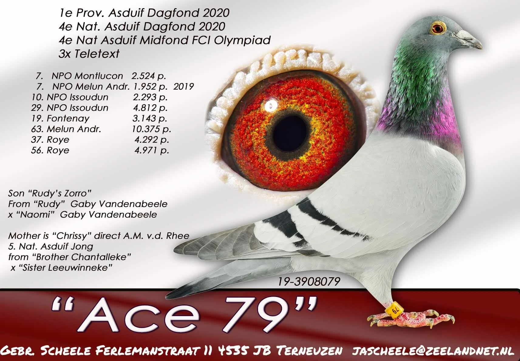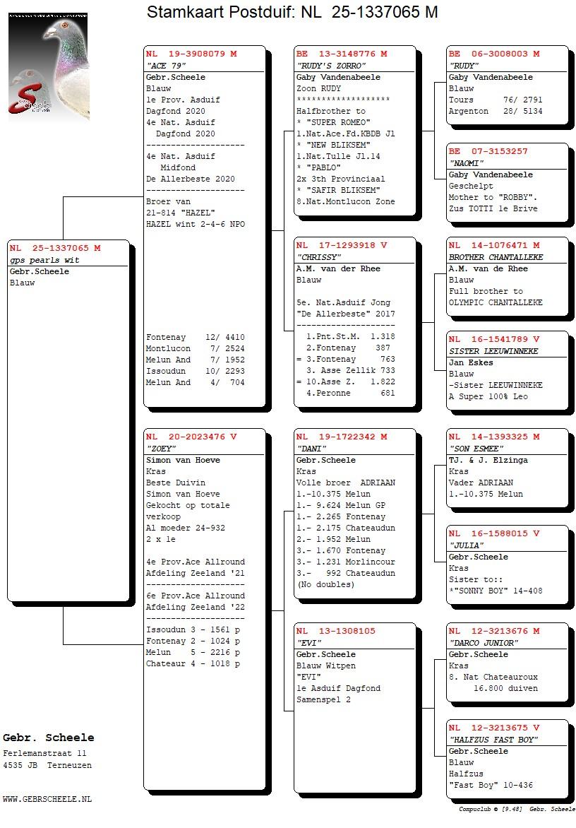 Uit: ”Ace 79”, 1. Prov. Asduif Dagfond, 4. Nat. Asduif Dagfond NPO, 4. Nat. Asduif Midfond, 7. NPO 1.952 d., 7. NPO 2.524 d., 12. NPO 4.410 d. x ”Zoey”, 4. & 6. Prov. Asduif Allround, gr-moeder ”GP 85”, 1. NPO GP Chateaudun