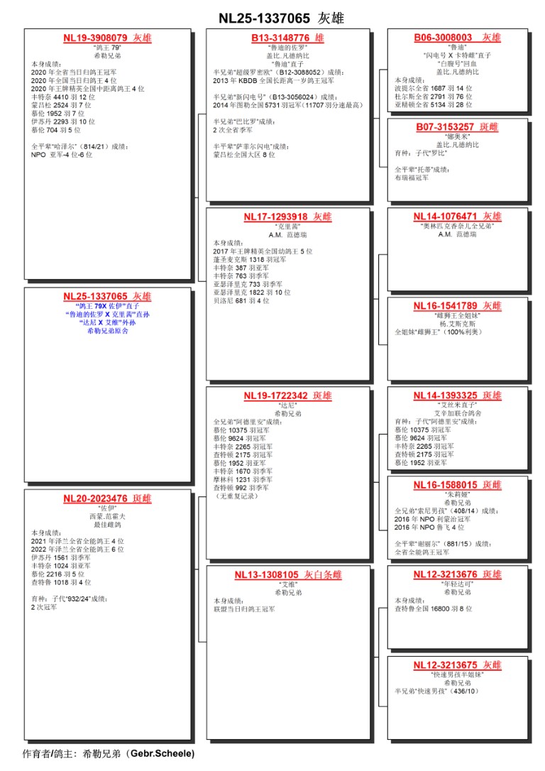 出自: ”鸽王79”, 省赛当日归长距离鸽王冠军, NPO全国当日归长距离鸽王4位, 全国中距离鸽王4位 , 7位 NPO 1.952 羽, 7位NPO 2.524 羽, 12位NPO 4.410 羽 x ”佐伊”, 省赛全能鸽王4位& 6位, 作出孙代 ”GP 85”, 1位NPO GP 查特顿