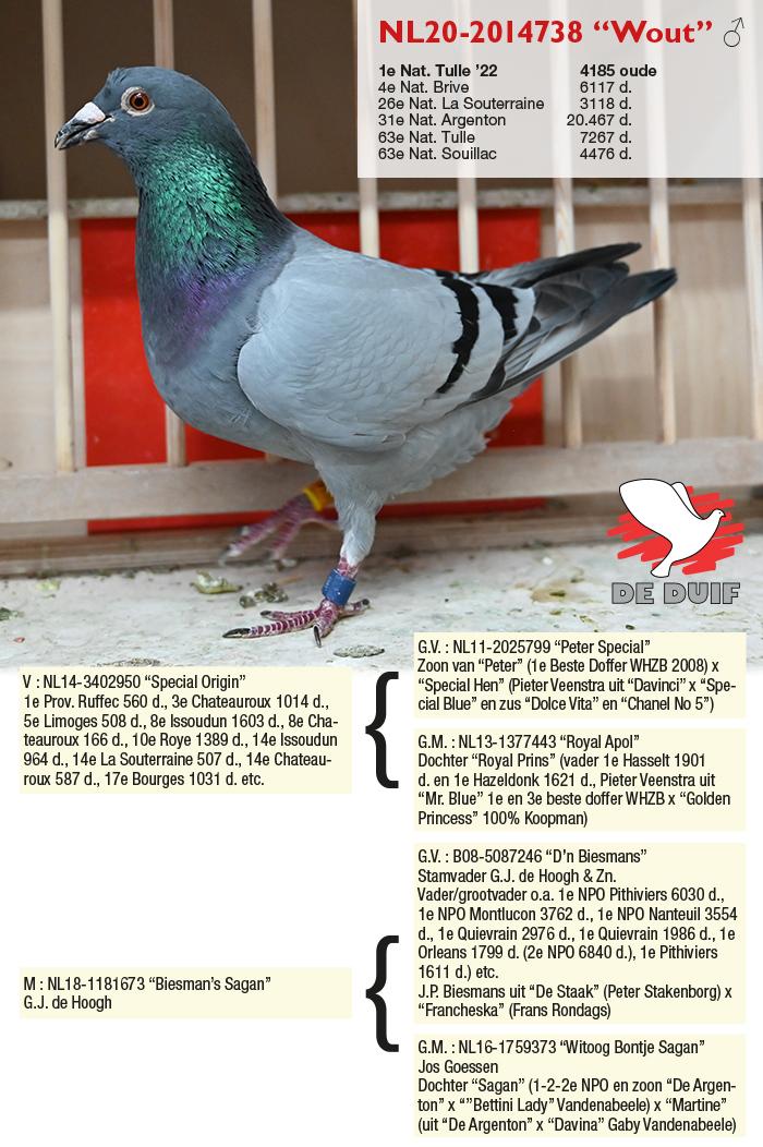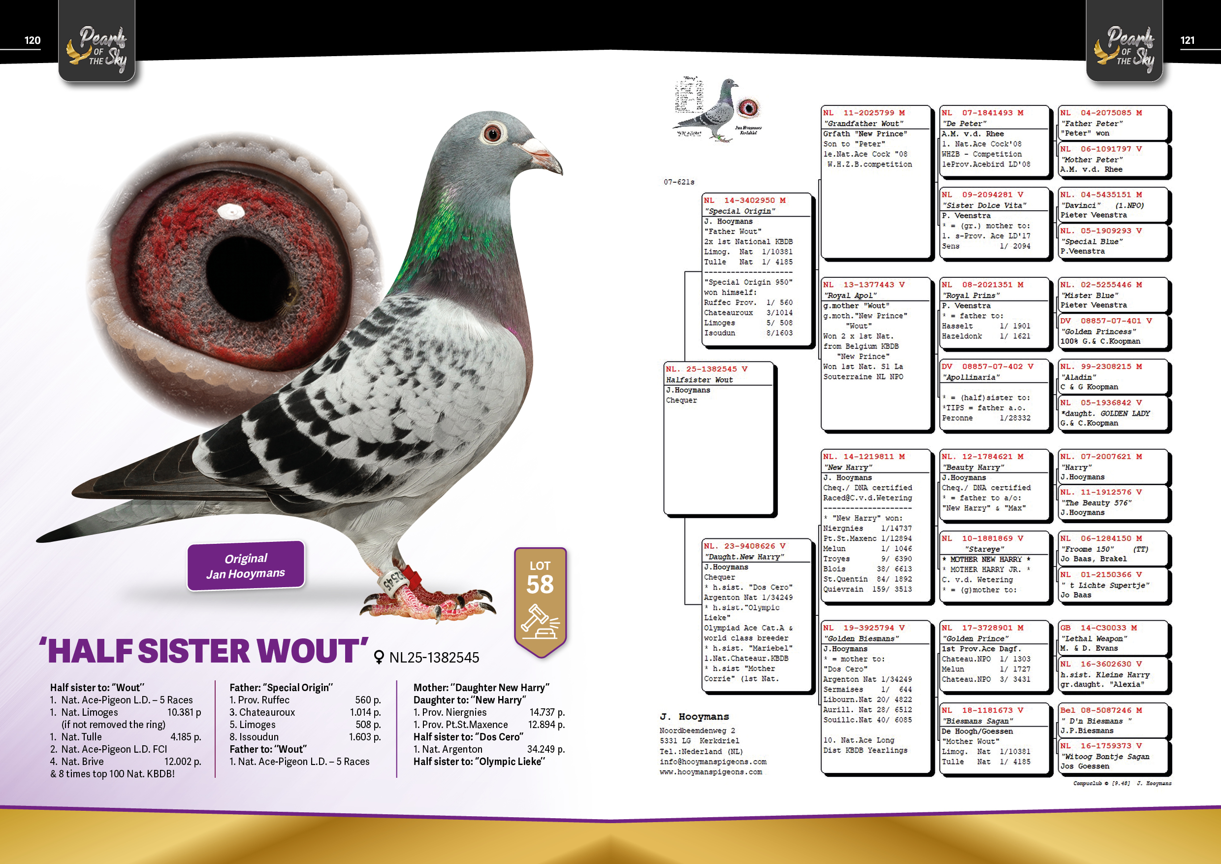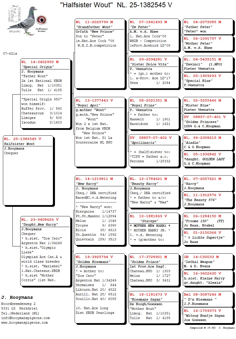 Uit: ”Special Origin”, 1. NPO Ruffec 560 d., vader ”Wout”, 1. Nat. Asduif Fond, 1. Nat. Limoges 10.381 d. (*), 1. Nat. Tulle 4.185 d. x ”Dtr. New Harry”, 1/2 zus 1. Nat. Argenton, 1. Nat. Chateauroux, Olympiade duif Cat. Snelheid