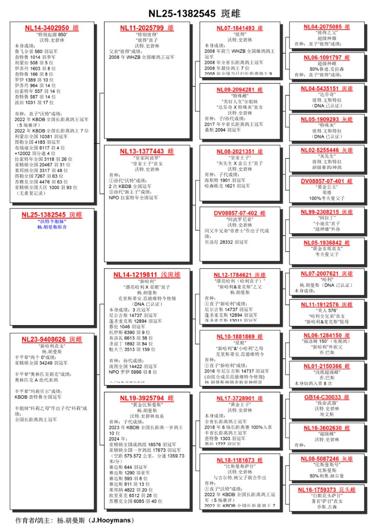出自: ”特别起源”, 1位NPO 鲁飞 560 羽, 作出子代 ”沃特”, 全国长距离鸽王冠军, 1位全国利蒙治 10.381 羽 (*), 1位全国图勒 4.185 羽 x ”新哈利女儿”, 半平辈: 1位全国亚精顿, 1位全国查特鲁, 奥林匹克速度代表鸽